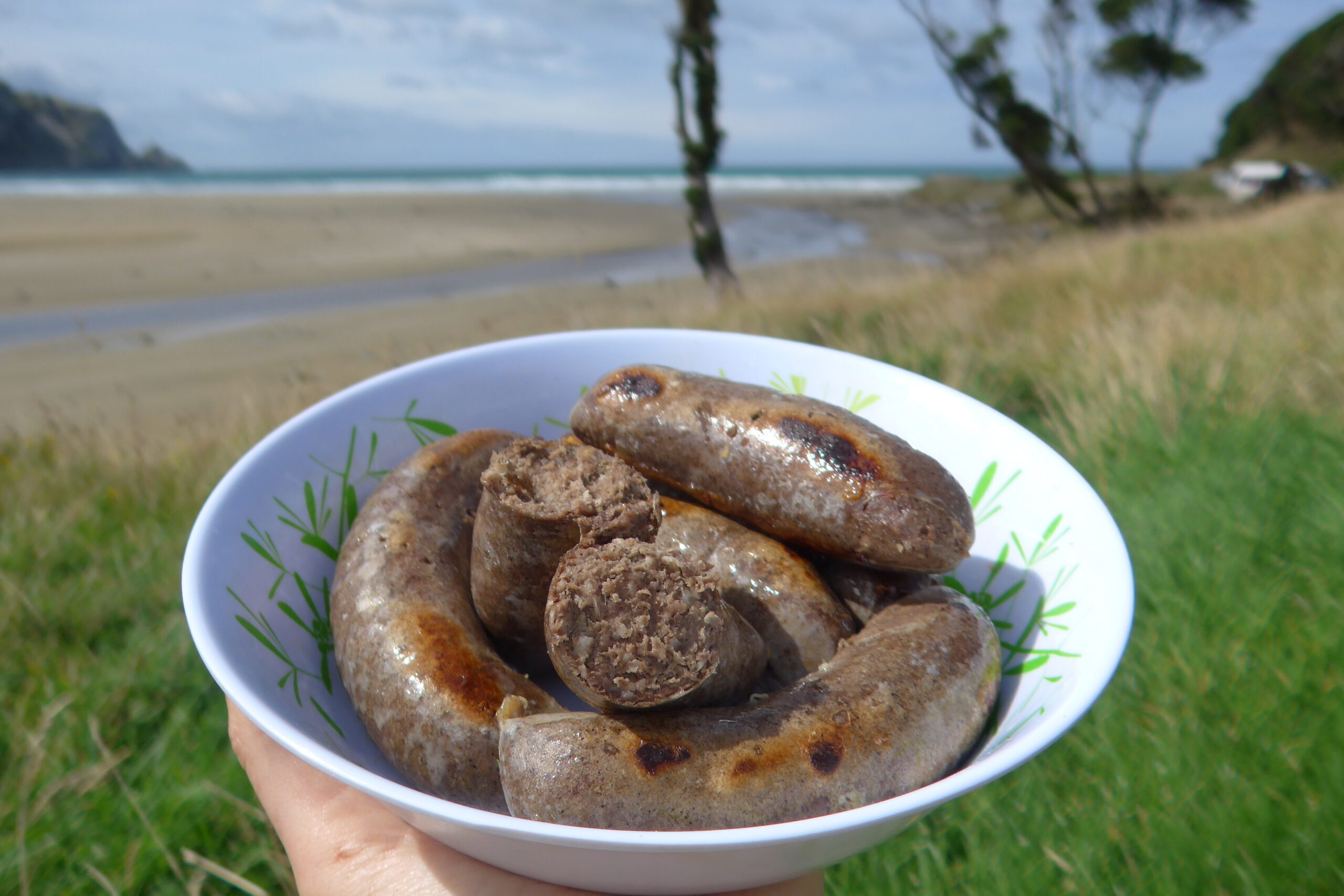 Free range eggs stand auf der Tafel vor dem Laden. Wir brauchten Nachschub, betraten den Laden – und kamen gerade rechtzeitig um zuzusehen, wie der Fleischer im hinteren Teil des Delis frische Würste machte.
