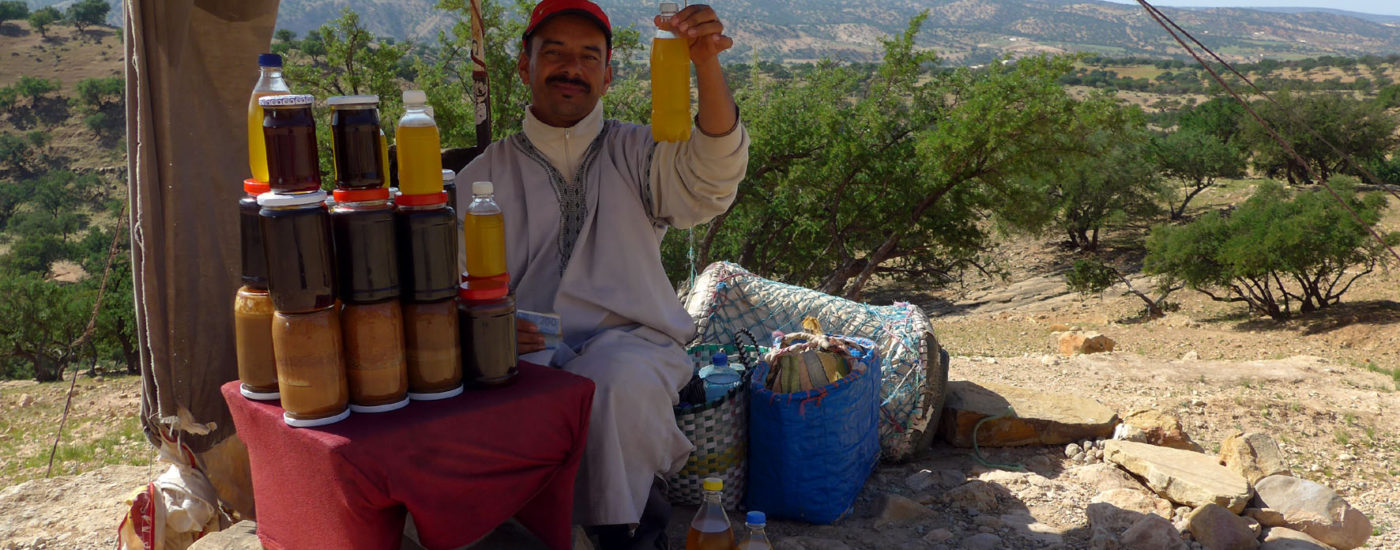Denn nur die Argan-Bauern mit ihren kleinen Verkaufsständen entlang der Landstraße N1 südlich von Smimou verkaufen das Original. Ihre Frauen haben es von Hand aus erstklassigem Arganöl, Argan-Honig und fein gemahlenen Mandeln (manchmal auch Erdnüssen statt Mandeln) zusammengerührt. Es enthält weder Geschmacksverstärker noch Stabilisatoren noch Konservierungsmittel und es wurde auch nicht mit anderen Ölen oder Zucker gestreckt (so wie das Amlou, was man im Supermarkt bekommt – was ich leider erst nach dem Einkauf im sehr sehr Kleingedruckten entdeckte).