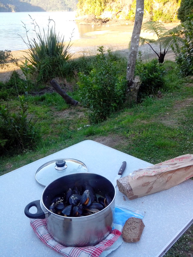 Ich weiß nicht, ob es an der absoluten Frische der Muscheln lag oder am Sauvignon Blanc, den ich zum Kochen verwendete. Vielleicht war es auch der Ausblick, den wir beim Essen genossen, untermalt vom Plätschern der Wellen und Vogelgesang. Auf jeden Fall waren diese ersten selbst gesammelten neuseeländischen Muscheln die besten, die wir je gegessen haben.