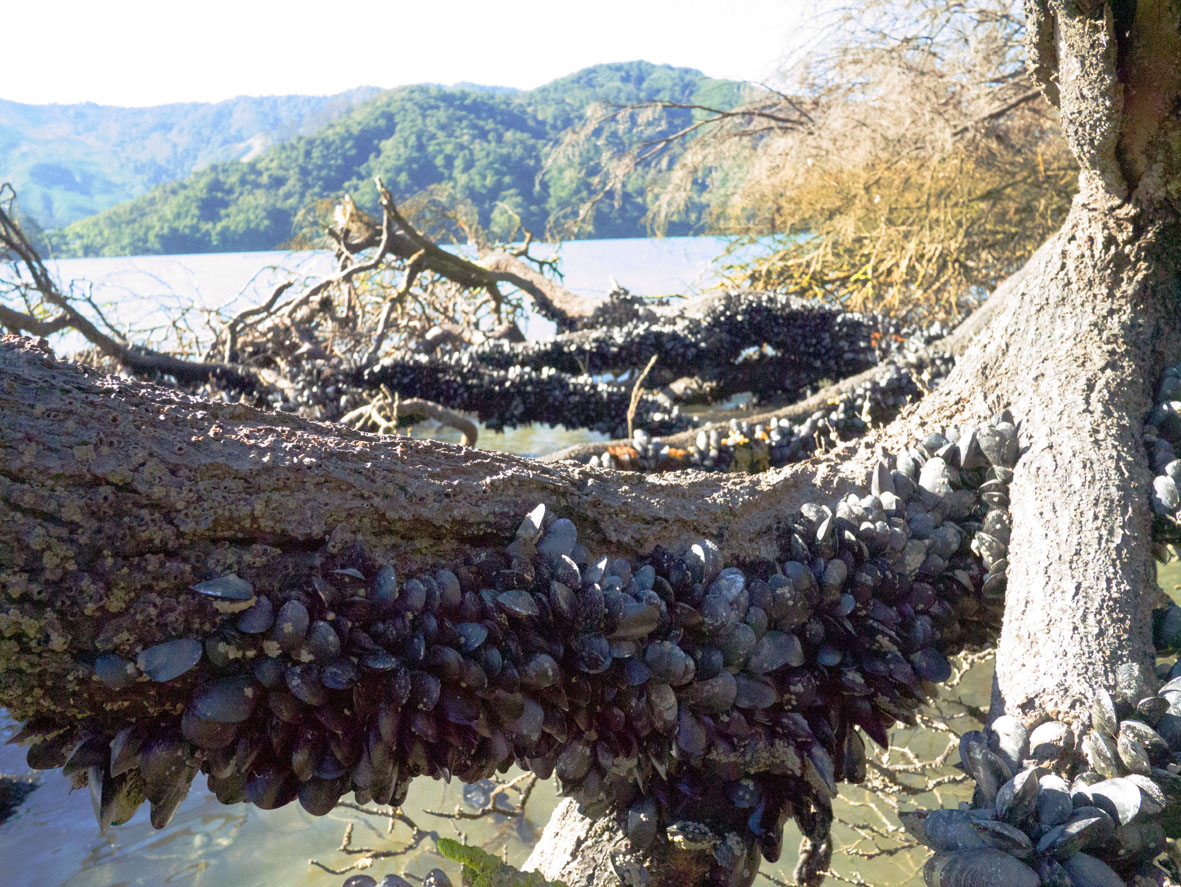 Kaum hatten die beiden uns ihre Ernte gezeigt, bekamen wir schlagartig Appetit auf Miesmuscheln in einem Weißweinsößchen. Ich schnappte mir eine Tüte, krempelte die Hosenbeine hoch und zog los. Als ich näher kam, erkannte ich, dass der ziemlich große Baum über und über von Muscheln bedeckt war. Sowas hatte ich noch nie gesehen. Vorsichtig machte ich mich daran, einige größere Exemplare zu pflücken, ohne die dazwischen wachsenden Babymuscheln mit herunter zu reißen. Innerhalb kürzester Zeit hatte ich eine üppige Portion zusammen.