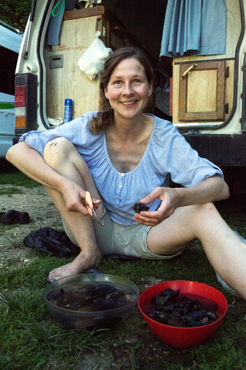 Da beobachteten wir nämlich, wie das Ehepaar im Nachbarcamper mit einem Eimer in der Hand auf einen großen Baum zu watete, der  umgestürzt, etwa 20 Meter vom Ufer entfernt im inzwischen sehr flachen Wasser lag. Dort begannen sie, irgend etwas von den Ästen zu pflücken. Miesmuscheln, wie sich herausstellte.