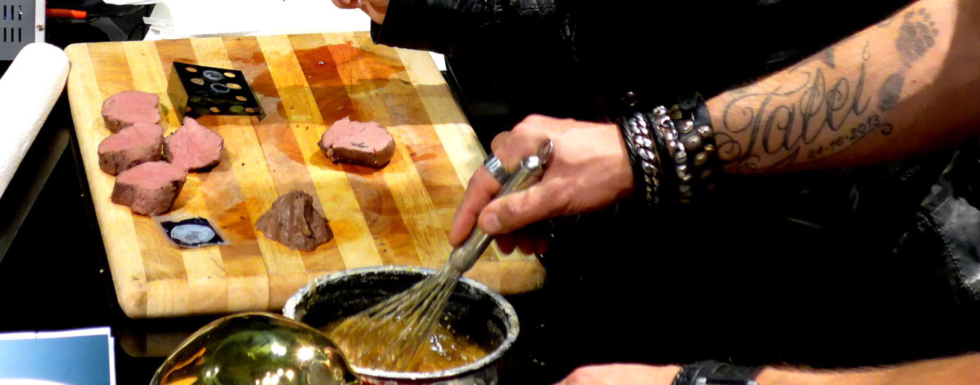 Schräg gegenüber, an der „Perfect Meat Academy“ war der letzte Workshop mit dem Fleischexperten Lucki Maurer (Koch, Wagyu-Rinder-Züchter und Autor für „Beef“) leider schon zu Ende gegangen. Ich entdeckte ihn dann aber (seinem markanten roten Bart sei Dank) auf der Hauptbühne in der hinteren Halle, wo er mit dem argentinischen Starkoch Chakall (Markenzeichen: Turban) Fleisch brutzelte. Kurzer Blick ins Programmheft: Aha – „Argentinian Beef Culture“. Ich ergatterte ein Probiertellerchen: zwei für meinen Geschmack noch ziemlich rohe Happen, die deutlich mehr Kauleistung verlangten als das Fleisch gerade eben (ok, das ist Jammern auf hohem Niveau), dazu eine kräuterige Sauce, die leider ein wenig strohig war und im Hals kratzte.