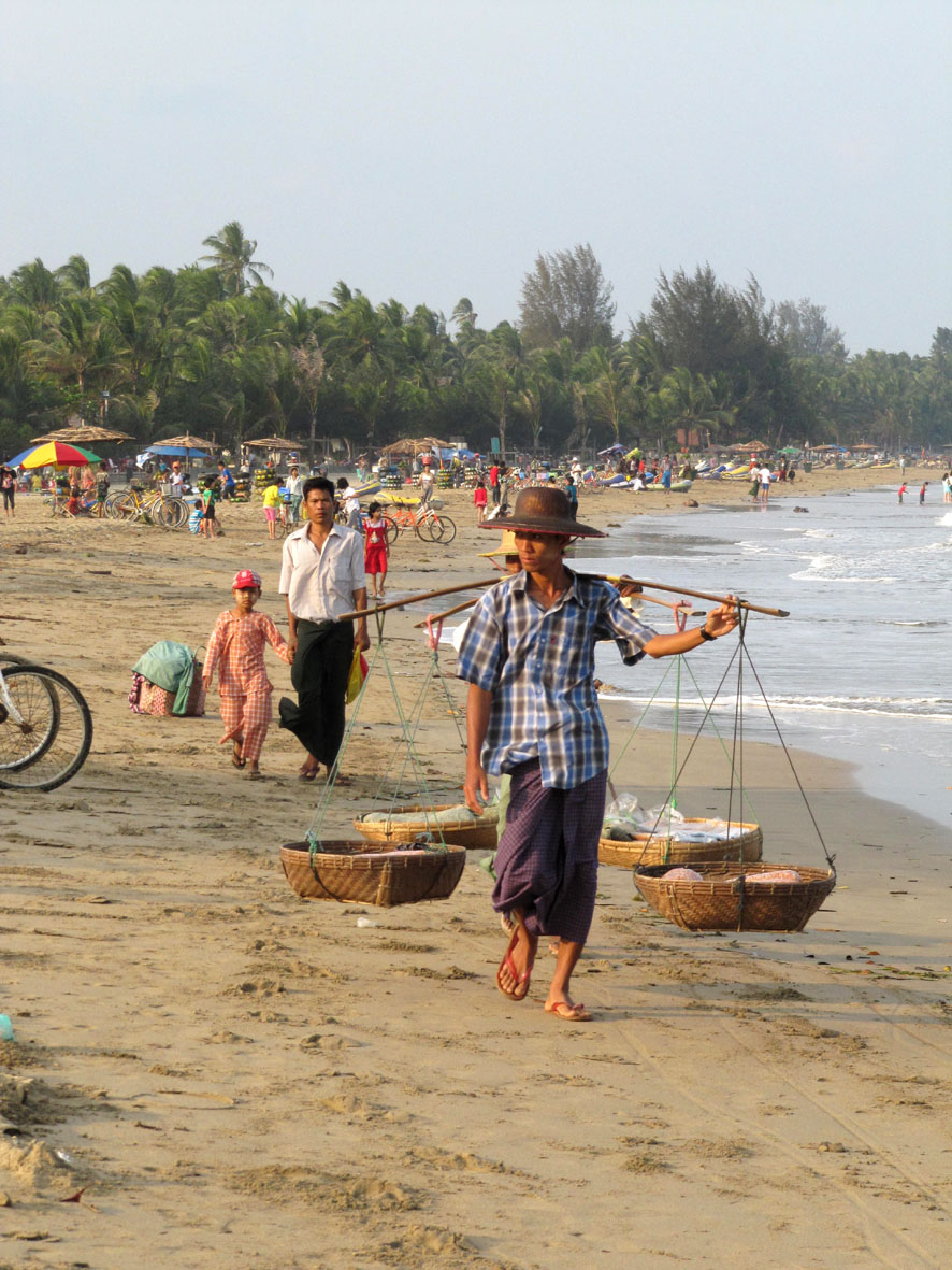 Zwei Strände sind von Yangon aus relativ schnell zu erreichen, erfahren wir. Übersetzt heißt das: etwa sieben Stunden Fahrt auf unbefestigten Straßen, in unklimatisierten Bussen, die eigentlich für den Stadtverkehr gebaut wurden, auf schmalen Sitzbänken, die jede Bodenwelle live ans Steißbein übertragen. Oder wenn der Bus sehr voll ist: auf einem Plastikhocker im Mittelgang. Das ist allerdings immer noch besser als 18 Stunden Rumpelpiste. So lange dauert nämlich die Fahrt an den schönsten Strand des Landes, Ngapali, an dem es auch nur entsprechend hochpreisige Unterkünfte gibt. Und mit etwas Pech Baulärm, denn seit der Strand boomt, übersteigt die Nachfrage das Bettenangebot. Wir müssen uns deshalb nur zwischen den gleich weit entfernten Stränden Ngwe Saung (bei Touristen sehr beliebt) und Chaungtha (wo die Einheimischen Urlaub machen) entscheiden – und das fällt uns leicht.