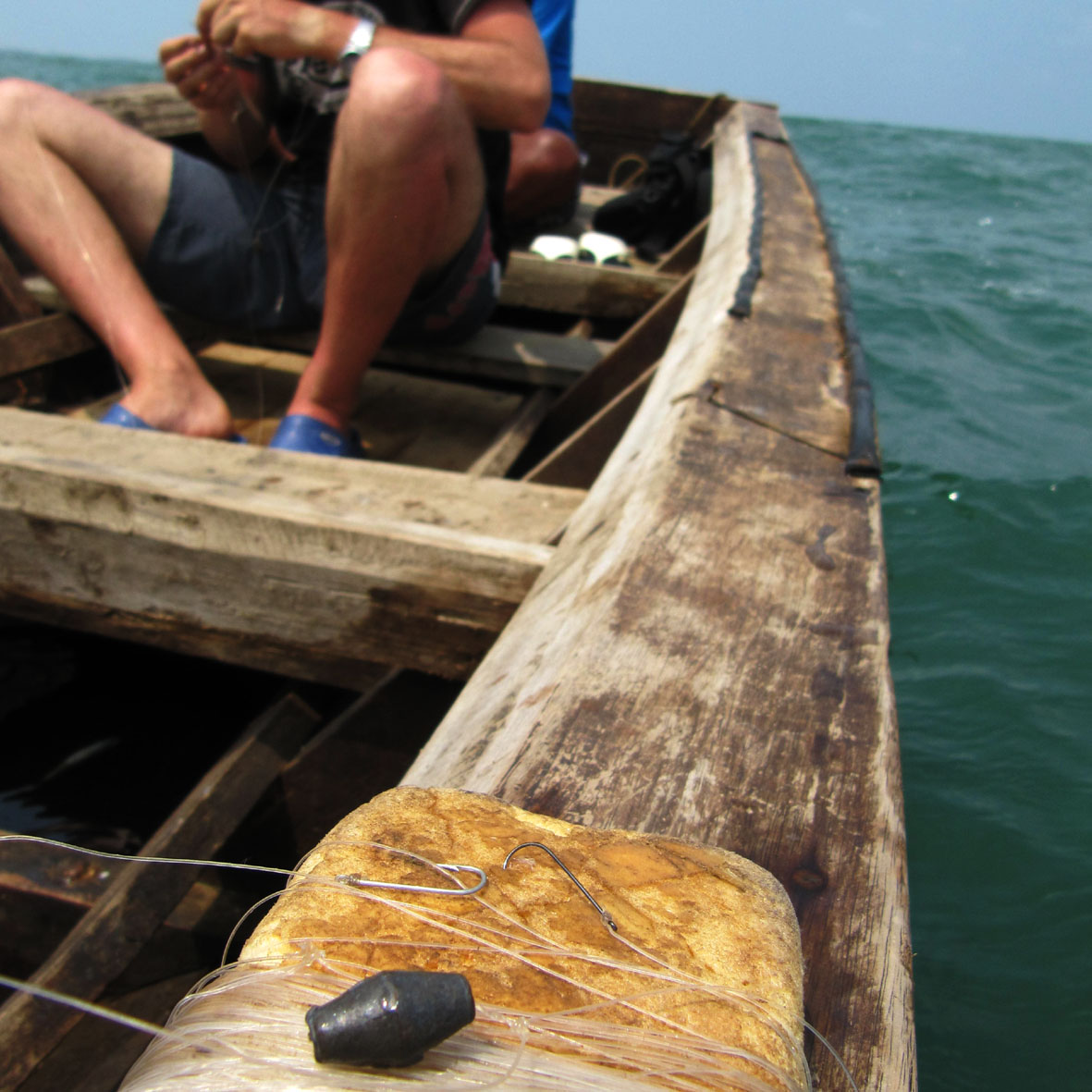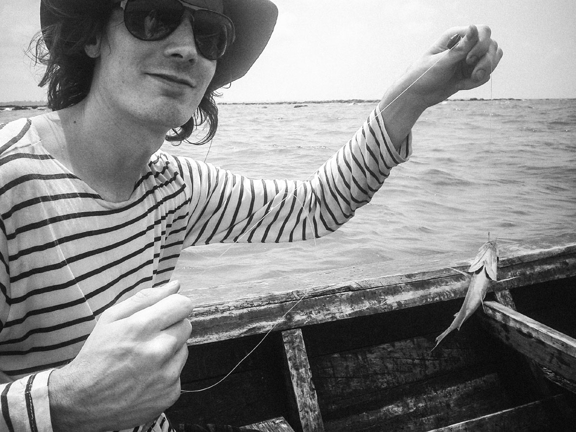 Als wir wieder ablegen und unsere Angeln ins Wasser halten, beißt auch fast sofort etwas an. Zumindest bei Kyaw Swa. Der hantiert geschickt mit dem Styroporklotz, an den er Angelschnur und zwei Haken befestigt hat und holt einen Fisch nach dem anderen heraus. Wir anderen verheddern uns erstmal beim Auswerfen und Einholen. Umso begeisterter begrüßen wir das erste bunte Schuppentier, das sich an unseren Haken verirrt. Da es auf dem Kahn natürlich auch keine Kühlung, geschweige denn Eis gibt, schöpft der Fischer einfach etwas Wasser auf den Boden und lässt unseren Fang darin schwimmen. Die Brühe hat zwar Badewannentemperatur, aber die Fische halten sich wacker.