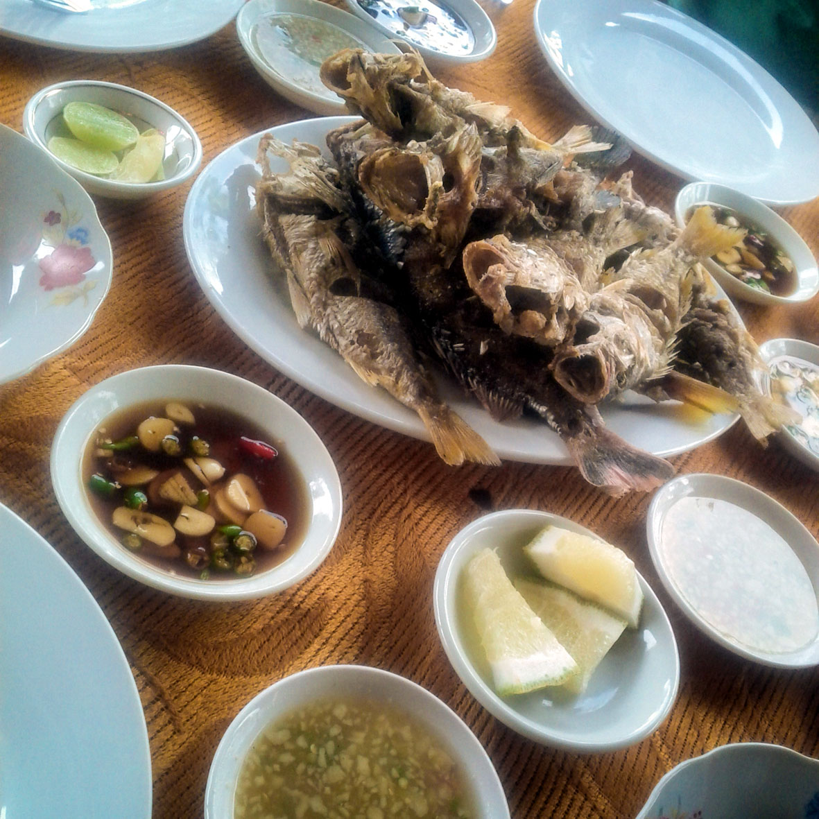 Gegen Mittag machen wir wieder am kleinen Hafen von Chaungtha Beach fest. Wir sind so hungrig, dass wir beschließen, Schweiß und Salzkruste erstmal zu ignorieren. Auf zwei Taxi-Mopeds gequetscht, brausen wir alle Mann zu William’s Guesthouse, wo unsere Fang direkt für uns zubereitet wird: Die kleineren Fische werden im Ganzen gebraten, zwei große Exemplare gekocht, außerdem bekommen wir eine schön scharfe Fischsuppe und wie immer jede Menge Beilagen. Köstlich!