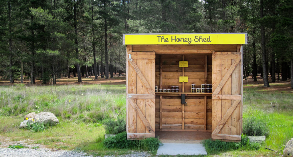 In einem kleinen, offenen Holzschuppen stehen auf einem Brettchen ein Dutzend Honigtöpfe: „Lindis Gold. Bee Keeper Artisan Honey“ steht darauf. 500 Gramm kosten $7, das Kilo $12. Dazu ein Kistchen mit Geldschlitz und ein Schild „Danke für Ihre Ehrlichkeit“. Es gibt drei Sorten: Clover, Vipers Bugloss (muss noch herausfinden, was das ist) – und Thymian. Der muss es natürlich sein.