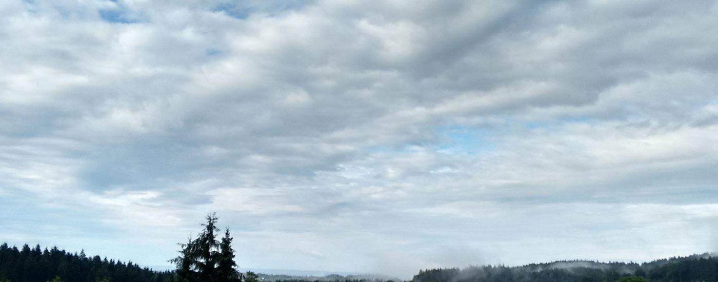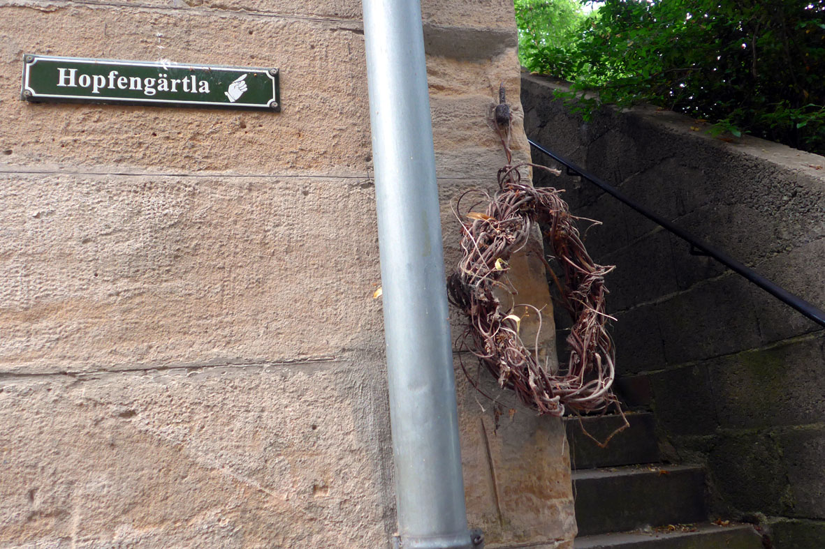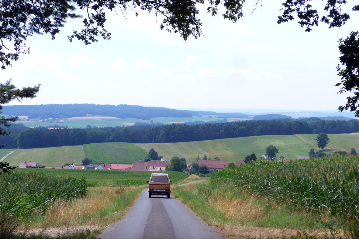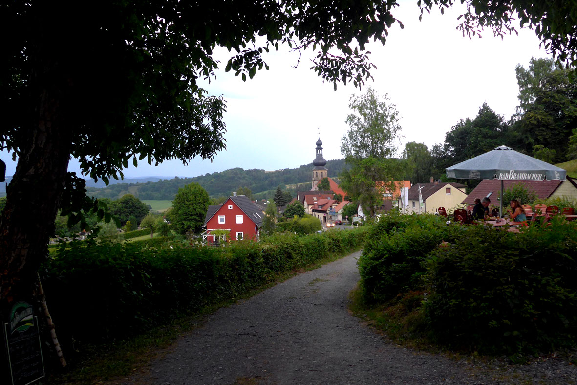 „Hopfengärtla“ steht auf dem Schild, das die Treppe hinauf zum Biergarten der Brauerei Haberstumpf zeigt, unserer ersten Station auf dem Bierpilgerpfad. Klingt das nicht einladend? Von dort oben schweift unser Blick über das Dorf mit dem markanten Kirchturm, über sanft gewellte Wiesen, Äcker, Wald und Hügel und landet schließlich bei dem Gewitterwolkengebirge, das sich am Horizont aufgebaut hat. Ein bisschen Zeit bleibt noch, bis es losgeht. Wir haben auch schon unseren Stellplatz auf einem kleinen Waldparkplatz oberhalb der Brauerei gefunden und können uns jetzt in Ruhe der Auswahl unseres Sundowners widmen.