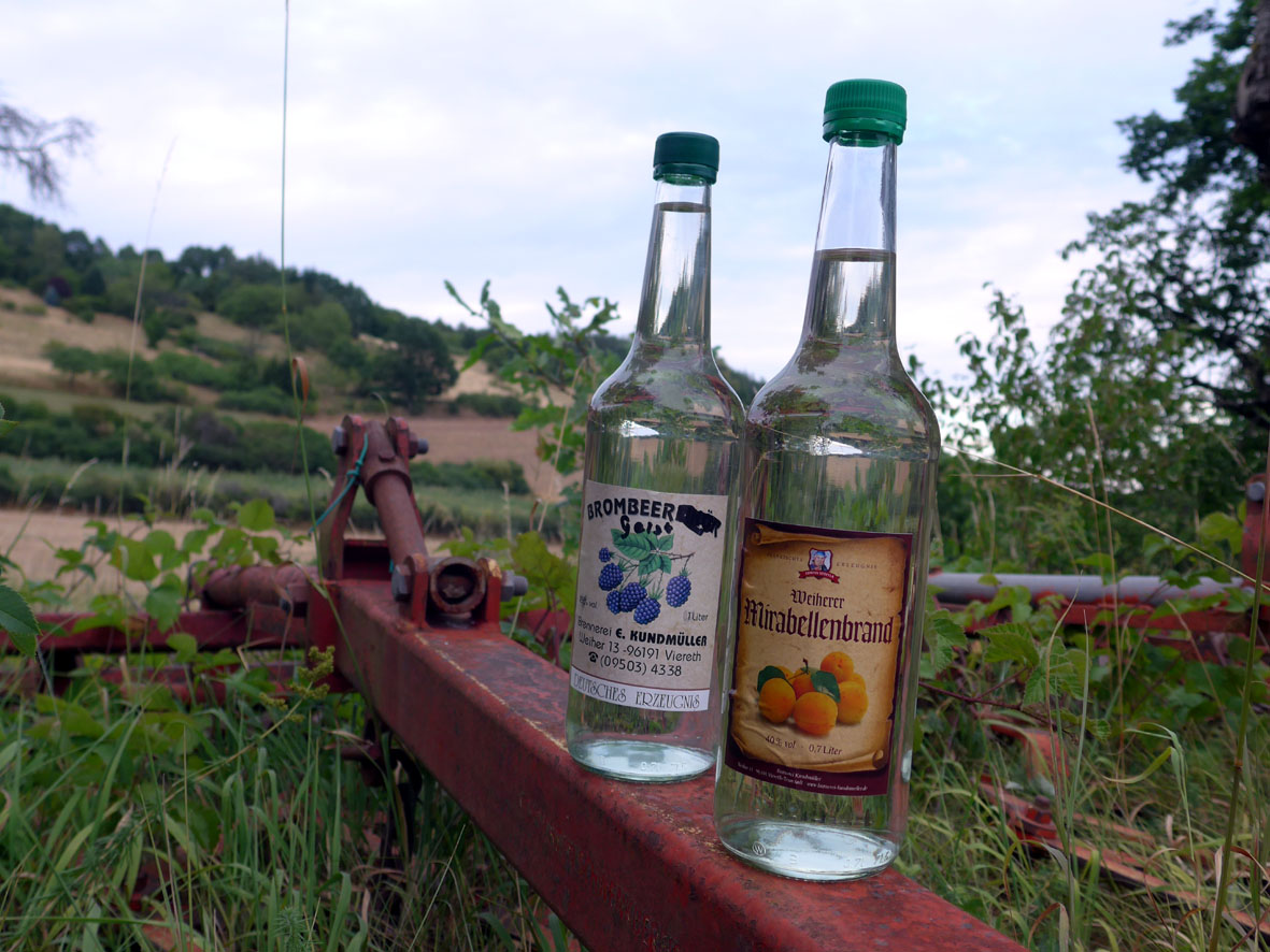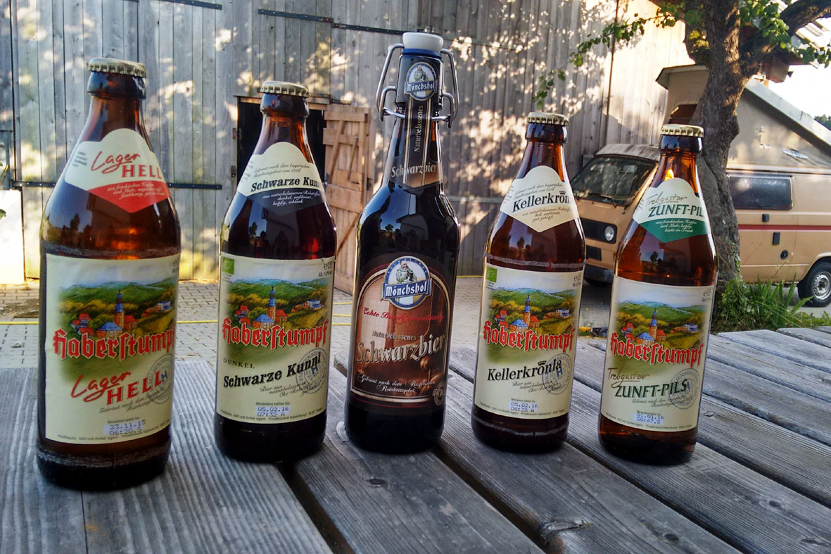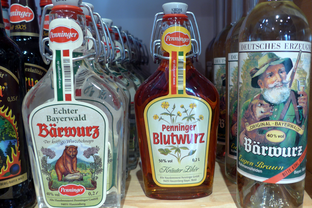 Jetzt muss ich aber doch mal probieren. Ein harter Job, so kurz nach dem Frühstück, das hatten wir zuletzt in Rumänien, ach nein, in Kirgistan (irgendwann werde ich diese Geschichten mal im Blog erzählen). Deshalb nippe ich auch nur kurz und trinke direkt Wasser hinterher. Ein Trick, den wir beim Wodka-Trinken mit Profis gelernt haben. Und tatsächlich bin ich anschließend nüchtern genug, um meinen Einkauf mit Contenance und einer soliden Auswahl zu Ende zu bringen: Löwenzahn-Marmelade, Waldfruchtessig, Leinsamen-Nudeln, Leberknödelgewürz, geräucherter Schinken und Kaminwurzen vom Hirsch, Bratenfleisch im Glas, eine Bio-Weisse und letztlich sowohl ein Flascherl Bärwurz als auch Blutwurz. Das alles findet neben dem stattlichen Biersortiment, welches wir in den Brauereien Kundmüller und Haberstumpf gekauft haben, gerade noch so in der Vorratskiste unter unserer Rückbank Platz. Mal schauen, wie viele dieser Leckereien es überhaupt bis nach Berlin schaffen …