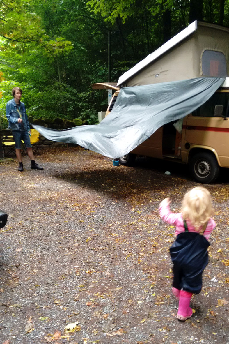 An diesem Abend haben wir Nachbarn: eine Familie aus Leipzig mit zwei Kindern, der Sohn so alt wie unsere Tochter. Die beiden verstehen sich auf Anhieb, zeigen sich gegenseitig ihr rollendes Zuhause und spielen mit allem, was sie rund um die Busse entdecken. Wir spannen Planen zwischen die beiden T3s, und als das Gewitter herangezogen ist, sitzen wir alle darunter, lauschen dem Regen und Donnergrollen, trinken gutes Bier und ducken uns lachend vor den Wasserfällen weg, die regelmäßig an den Seiten unseres Behelfsdaches herunter stürzen. Wie schade, dass die Leipziger am nächsten Tag schon nach Hause fahren!