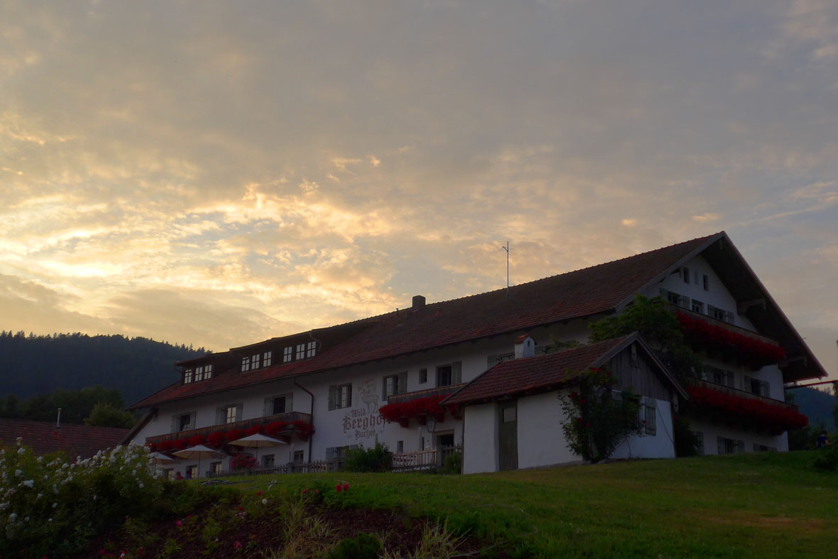 Auf dem Wild-Berghof Buchet schaut es dann allerdings so aus, wie man es aus Heimatfilmen kennt. Saftig-grüne Wiesen, dichter Nadelwald, für Großfamilien gebaute wuchtige Holzhäuser, Geranien, Hirschgeweihe, Männer in Lederhosen. Und auf dem weitläufigen Gelände gleich unterhalb unseres Stellplatzes: das größte Hirschwild-Reservat des Bayrischen Waldes. Dass die Welt auch hier nicht in bester Ordnung ist, erfahren wir vom Senior des Familienbetriebes. Überschwänglich begrüßt er die kleine Co-Jägerin, die den großen Hund zu seinen Füßen streicheln möchte, und erzählt uns dann, dass der Gegend eine ganze Generation fehle, die Jungen zögen alle weg.