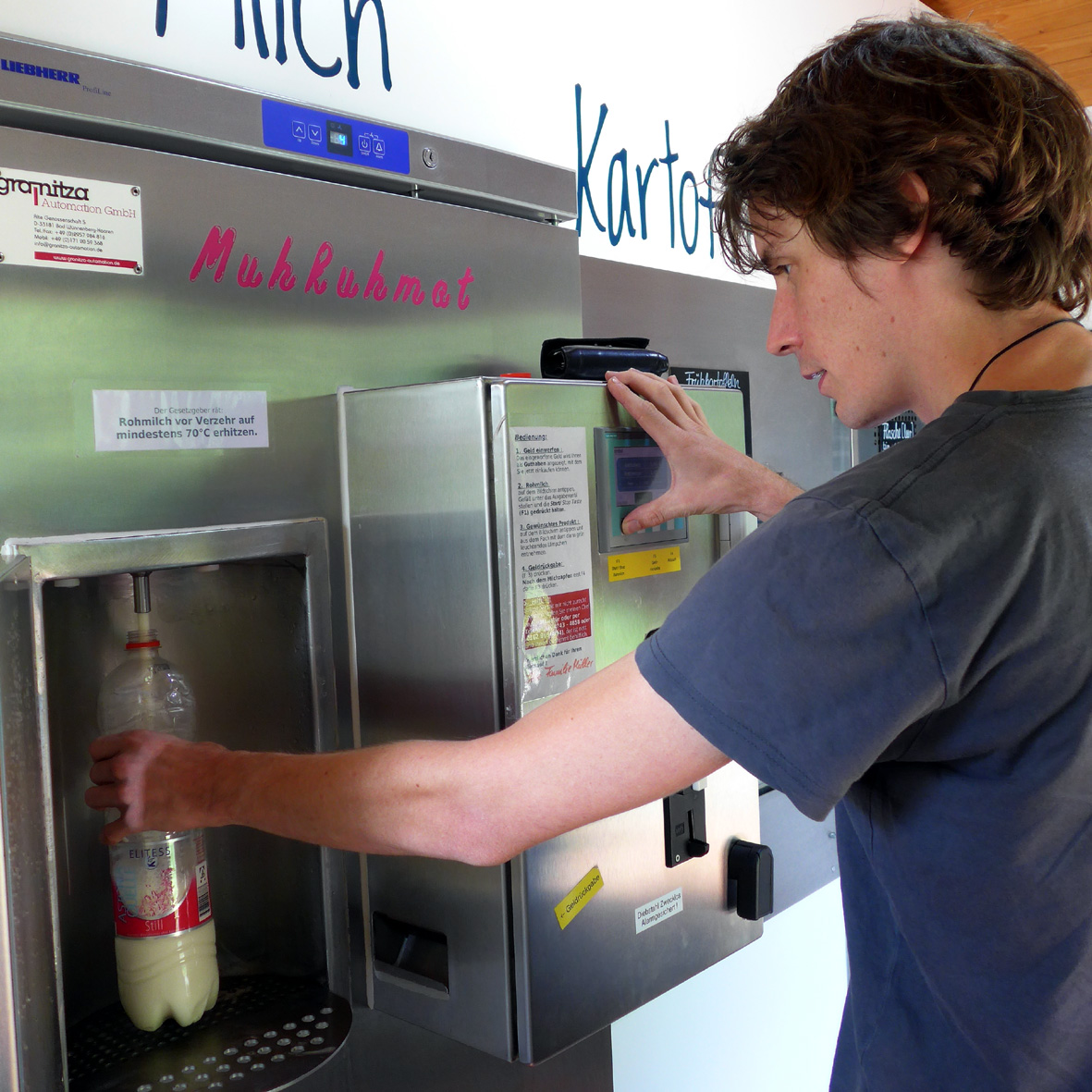 Was uns auf den ersten Blick an eine honesty box erinnerte, wie wir sie ebenfalls am anderen Ende der Welt kennen und lieben gelernt haben, entpuppt sich, nachdem wir eingetreten sind, als high-tech Selbstbedienungsladen des benachbarten Bauernhofes. Hinter Edelstahlluken warten Eier, Kartoffeln und Milch auf unseren Geldeinwurf. Wir können unser Glück kaum fassen: Rohmilch! Also Milch, die nicht homogenisiert wurde (sprich: das Fett darin in winzige Bestandteile zersiebt und gleichmäßig mit dem wässrigen Anteil vermischt) und auch nicht pasteurisiert (durch Erhitzen haltbar gemacht) oder gar ultrahocherhitzt, sondern frisch aus einem Euter, der zu einer nebenan grasenden Kuh gehört.