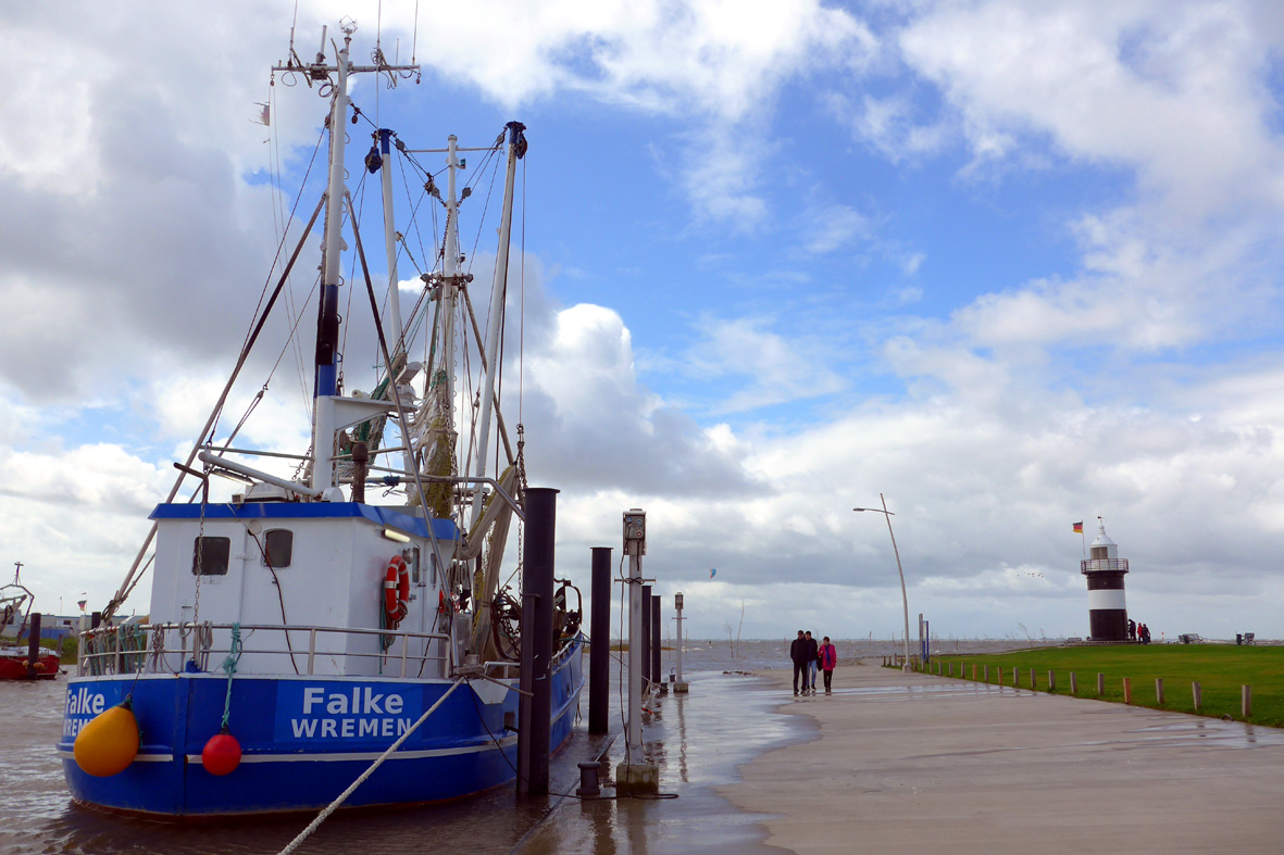 Seit drei Tagen lägen sie schon hier, erzählt mir die amtierende Krabbenpulmeisterin, als wir am Wremer Kutterhafen nach Granat (wie die kleinen Nordseegarnelen hier oben genannt werden) Ausschau halten. Sie ist trotzdem mit Mann und Sohn an Bord, zu tun ist immer etwas. Nächstes Wochenende sei Kutterregatta in Fedderwardersiel, bis dahin habe sich das Wetter hoffentlich gebessert. Ob wir nicht auch kommen wollen? Verlockend klingt das schon: Auf einem echten Krabbenkutter mitfahren und anschließend den Profis beim Wett-Pulen der kleinen Garnelen zuschauen. Oder aus Jux vielleicht sogar selbst teilnehmen. Schließlich habe ich schon mit drei Jahren meinen ersten Granat gepult – so erinnern es zumindest meine Eltern.