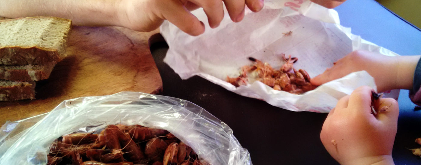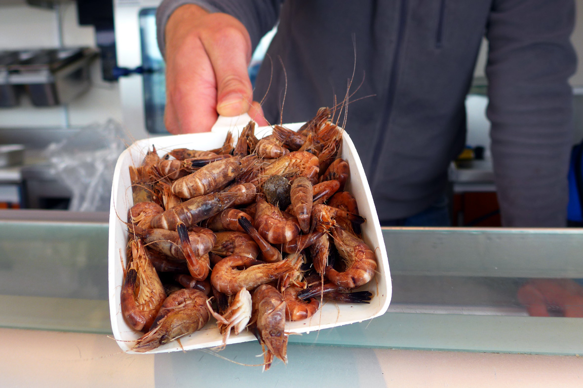 Und dann sitzen wir um unseren wackeligen Schwenktisch in der Bulli-Kombüse, der kleine grau-rosa Haufen in unserer Mitte und es geht los. Meine Finger scheinen ein gutes Gedächtnis zu haben, nur hin und wieder reißt der weiche Krabbenpanzer an der falschen Stelle und ich muss ihn und die zehn Beinpaare, die unten dran hängen, mühsam herunterfriemeln. Auch unsere kleine Feinschmeckerin hat viel Spaß mit den lustig aussehenden glubschäugigen Tierchen und kaut die Schalen, die sie nicht erwischt hat, kurzerhand mit. Zumindest bis sie merkt, wie viel besser es von meinem gepulten Haufen schmeckt. Nur der Co-Jäger flucht vor sich hin, während er versucht, seine Hände durch konzentriertes Starren zu hypnotisieren.