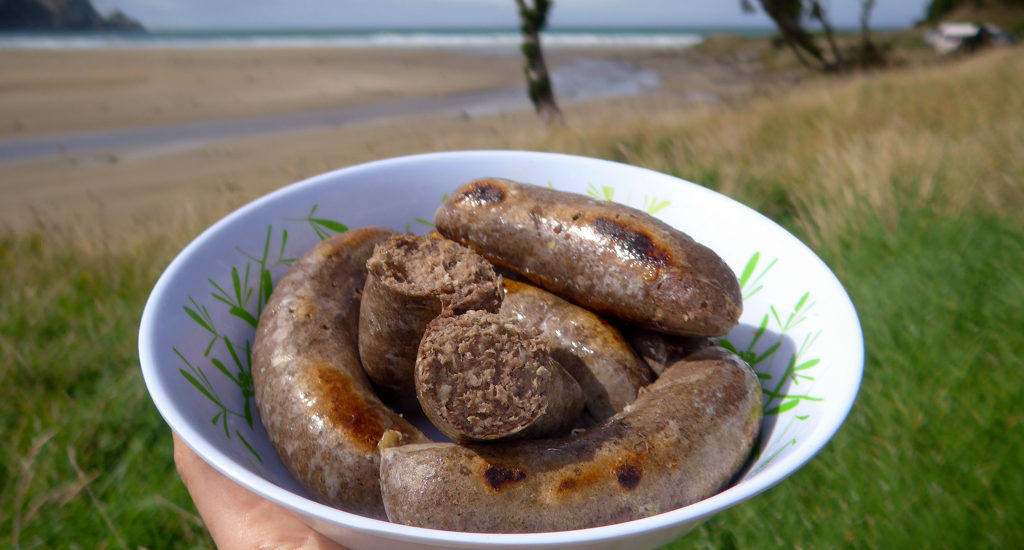 „Jetzt müssen Sie mir aber noch verraten, was drin ist“, sagte ich noch, als ich die Würste in Empfang nahm. Die Verkäuferin zuckte zusammen und eine leichte Röte überzog ihr Gesicht, als sie erwiderte: „Das Rezept ist geheim!“ – „Ich meinte nicht im Detail“, beschwichtigte ich. „Nur ungefähr. Widerstrebend sagte sie: „Rind, Niere und Haferflocken.“