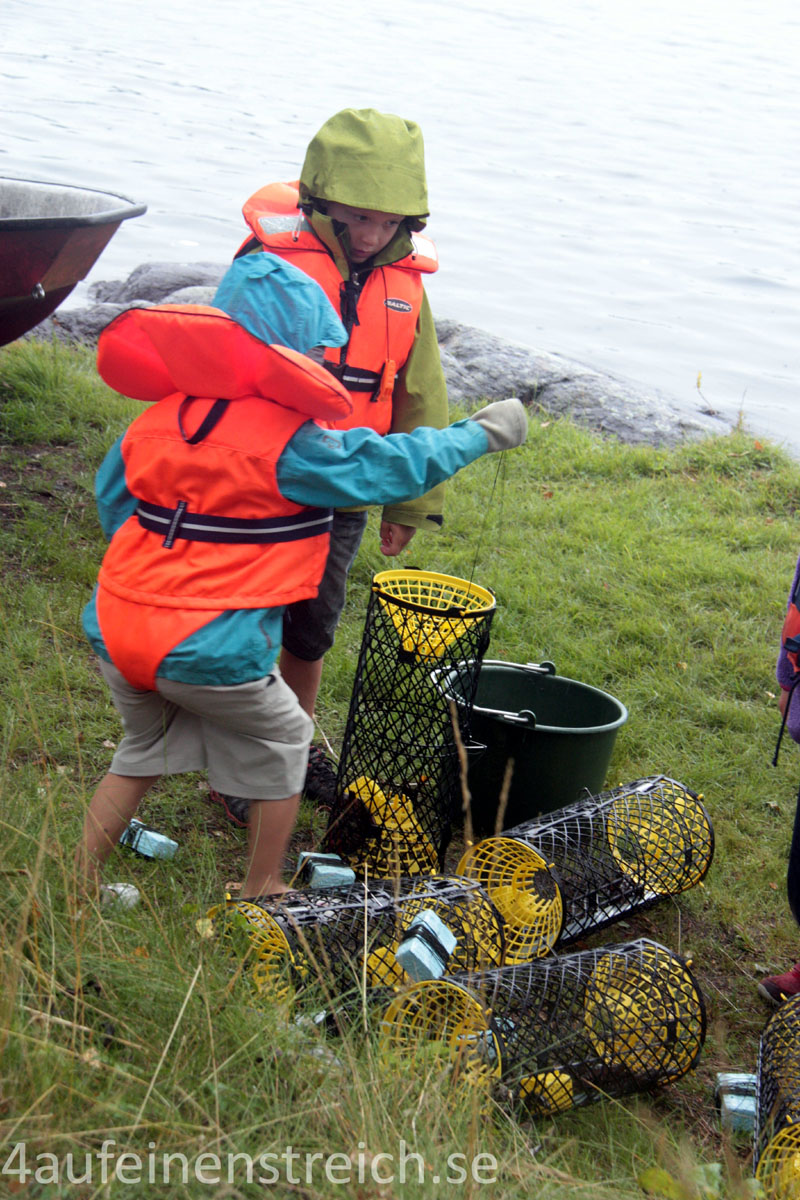 Wenn wir bei unseren Freunden sind, werden am Vortag des geplanten Festschmauses erst einmal die Reusen zu Wasser gelassen. Dazu fahren wir mit dem Ruderboot raus auf den See vor ihrem Sommerhaus. Einige Reusen platzieren wir aber auch gerne in Ufernähe und im Schilf. Die Schweden haben da meist so ihre Erfahrungswerte, wo sich die Krebse am ehesten aufhalten. Aber aufgepasst, das Krebsefischen ist nicht öffentlich erlaubt! Man muss entweder eine Genehmigung haben oder irgendwo ein Stück Wasserfläche mit Fangrecht besitzen. Wildern kommt leider trotzdem vor, jedes Jahr liest man von Leuten, die von der Polizei in flagranti erwischt werden.