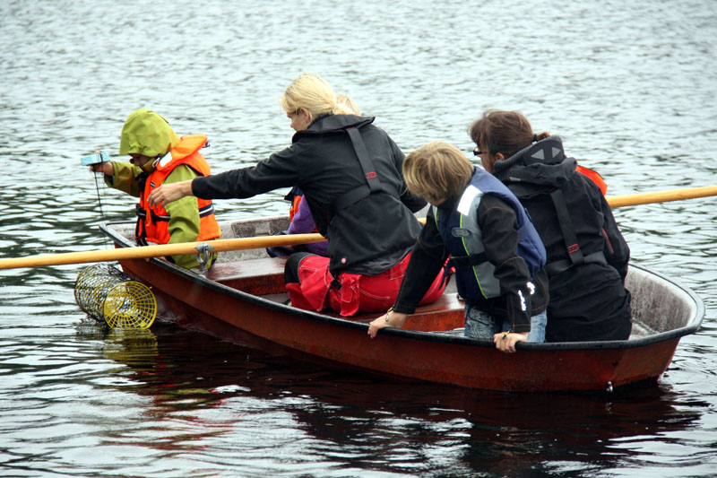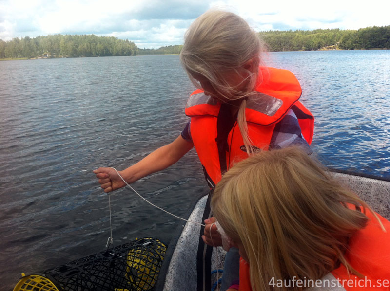 Am nächsten Tag kommt dann der spannende Moment, wenn wir die Reusen wieder einholen. Natürlich hoffen wir auf einen großen Fang und ziehen erwartungsvoll an den Schnüren. Meist wollen alle Kinder gleichzeitig ziehen und zuerst sehen, wie viele Krebse wohl in die Reuse gegangen sind. Da ist es oft gar nicht so einfach, das Boot im Wasser auf Kurs zu halten und wenn sich alle gleichzeitig auf eine Seite lehnen, muss man schon mal eingreifen … Eine bestimmte Größe sollten die Krebse allerdings schon haben, sonst wirft man sie am besten gleich wieder zurück. Wir wollen ja auch noch im Jahr darauf welche fangen können.