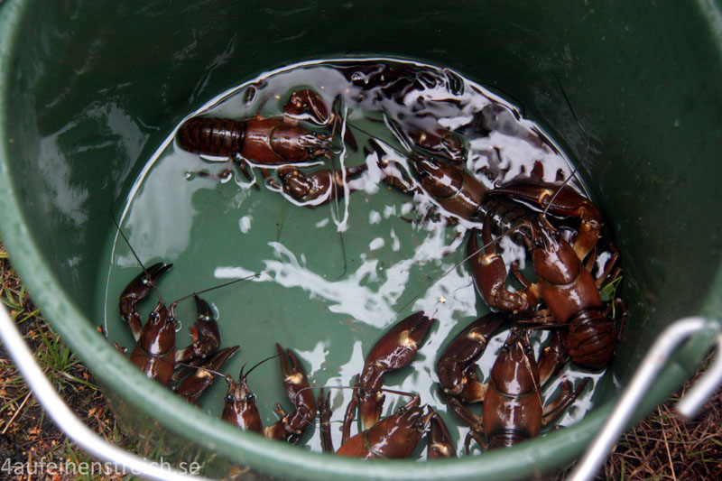 Seit einigen Jahren haben auch wir die Möglichkeit, bei lieben Freunden von uns das Krebseessen so richtig zu erleben. Dabei steht nicht der Verzehr im Vordergrund, sondern das Drumherum: dass man Freunde trifft und eine schöne Zeit zusammen verbringt und dass man die Krebse zusammen fängt. Das begeistert vor allem unseren Sohn, der für seinen Geschmack viel zu selten zum Angeln kommt.