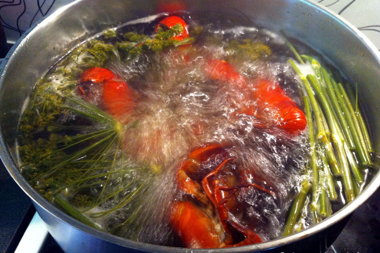 Hat man die Krebse mit den Reusen an Land gebracht und in einem Eimer gesammelt, ist es bald an der Zeit sie ihrer weiteren Bestimmung zu übergeben, sprich: dem Kochtopf! Man kocht die Krebse in einer Art Sud, immer mit viel Kronendill, Salz, Zucker und je nach Vorliebe eventuell auch noch Bier. Für mich ist es immer ein etwas komischer Moment, wenn wir das lebende Tier ins kochende Wasser legen, wo es innerhalb von Bruchteilen einer Sekunde stirbt und seine für gekochte Krebse so typische rote Farbe annimmt. Das ist sicher nicht jedermanns Sache …