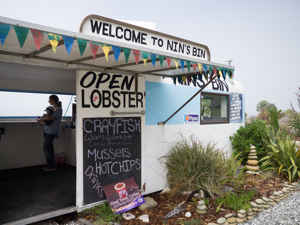 Nin’s Bin ist kein Geheimtipp. Es ist kein fancy Restaurant (das findet man in Kaikoura). Und sollte es regnen, muss man in dem spärlich möblierten Büdchen im Stehen essen (immerhin mit Meerblick). Aber das ist egal. Wer hier herkommt, will einfach nur das in Reinform futtern, wofür dieser Küstenstreifen so bekannt ist, dass sogar eine Stadt danach benannt wurde: