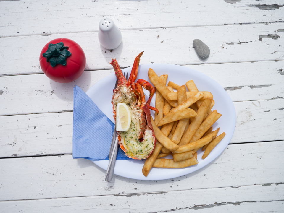Jeden Morgen fährt Ricks Bruder mit dem Boot seine Fallen ab und sammelt die langfühlerigen Panzerträger ein, manche direkt an den Felsen, die vor dem Imbiss wie ins Meer gestreut daliegen. Sie werden gekocht, gewogen und ein entsprechender Preis auf ihrem feuerroten Hinterteil mit Edding vermerkt, bevor sie in einer eisgekühlten Styroporbox auf dem Tresen auf Kundschaft warten. Die muss dann nur noch eine einzige Entscheidung treffen: Kalt mit Zitronensaft oder warm mit heißer Knoblauchbutter? Okay, und eine zweite: Fritten dazu?