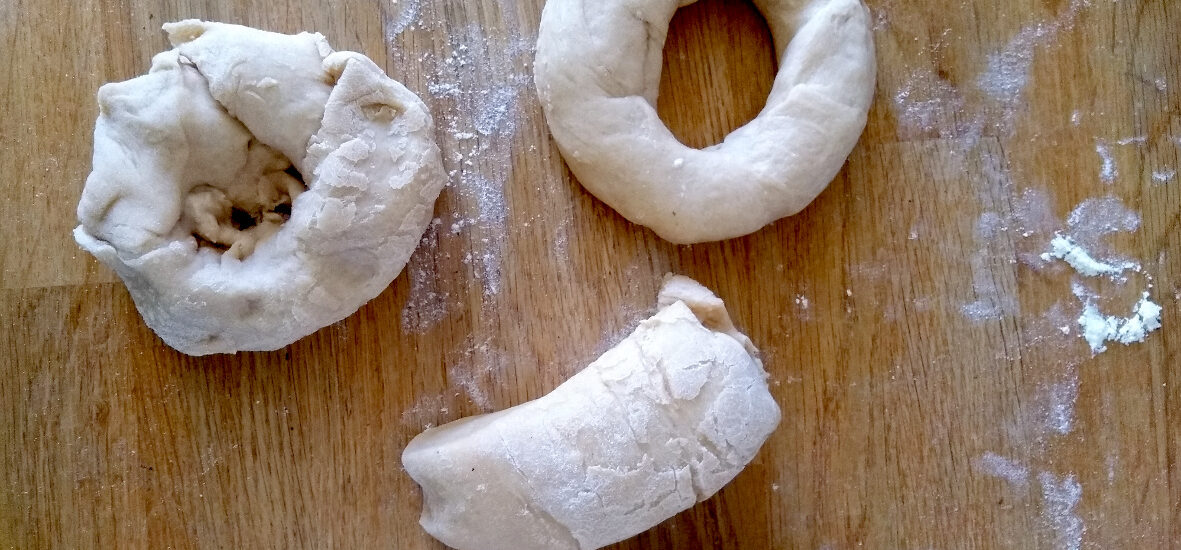 Letztlich sah der Teig aber doch ganz anständig aus und es gelang der kleinen Co-Jägerin und mir, recht gleichmäßige Kringel zu formen. Diese müssen, das ist super wichtig, eine glatte Oberfläche haben. Denn sonst dringt das Kochwasser, in das man die Bagel für ein paar Minuten legt, ehe man sie in den Backofen schiebt, in den Teig ein und macht ihn matschig, statt ihn einfach nur kurz zu brühen (das ist uns bei unserem ersten Versuch vor einigen Monaten passiert…). Wichtig ist auch, dass das Wasser nur ganz leicht kocht und die Bagel eher ziehen als in wilden Blubberblasen zu tanzen – ähnlich wie bei Semmelknödeln.