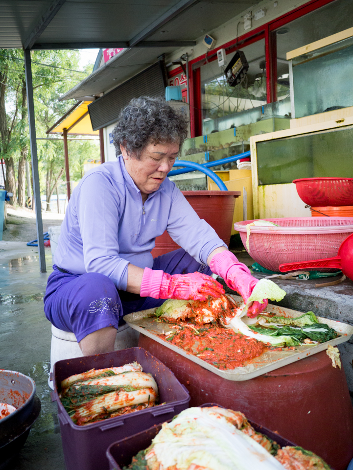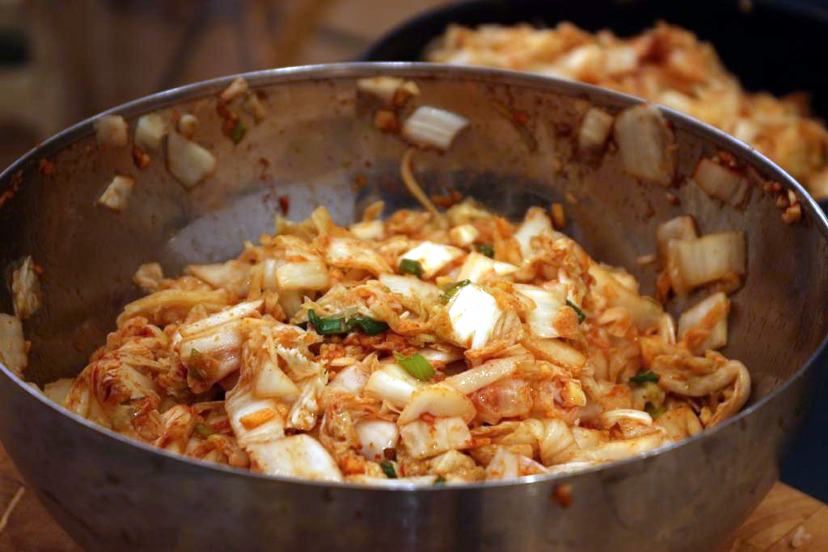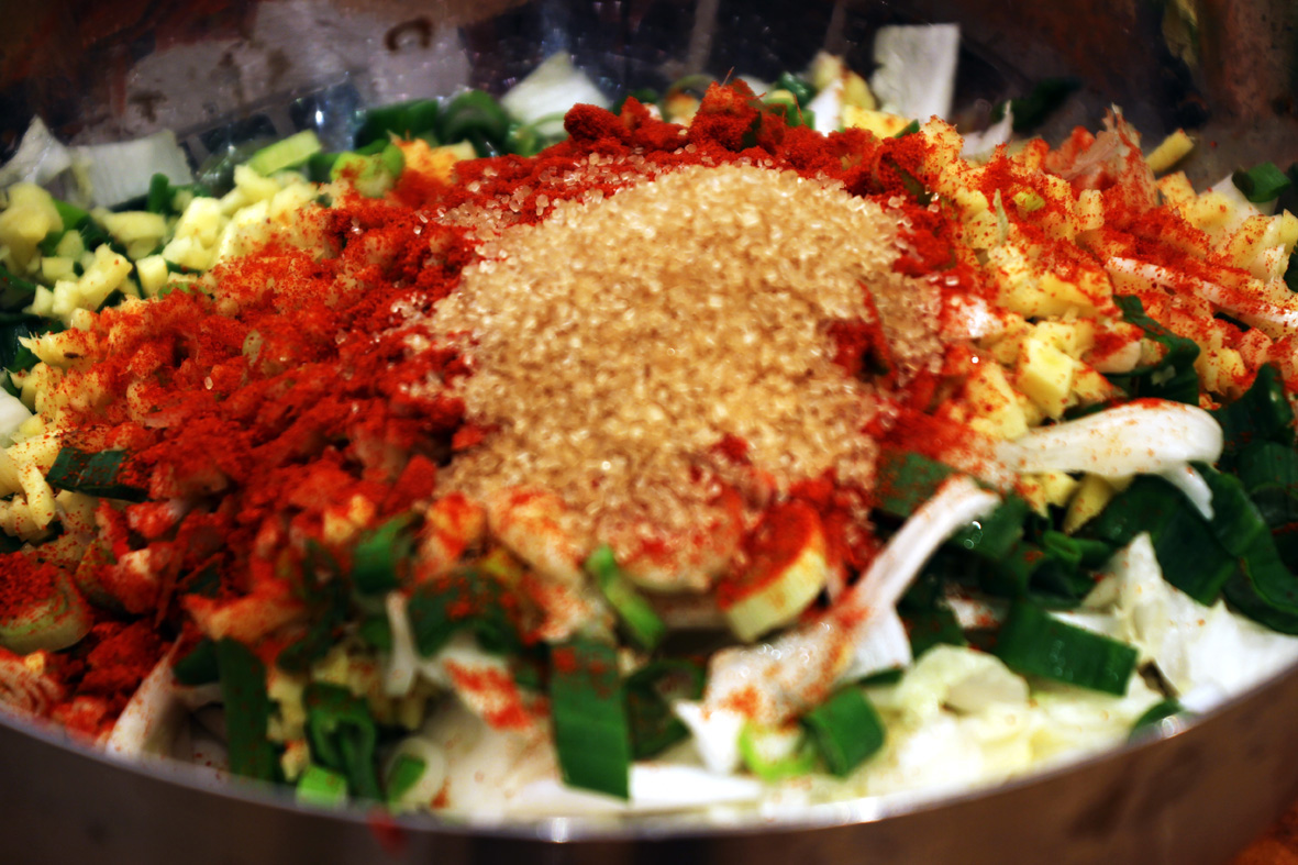 Während der Kohl abtropft, bereitet ihr die Marinade zu: Als erstes wird das Reismehl in einer Tasse Wasser angerührt und kurz aufgekocht, bis es richtig sämig ist. Dazu kommen der Zucker, das in dünne Streifen oder Ringe (die Frühlingszwiebeln) geschnittene Gemüse, der geriebene oder pürierte Ingwer und der Knoblauch, das Chilipulver und die Fischsauce. Und alles mögliche andere, was gerade in der Küche übrig ist – viele schwören auf eine Birne, auf Shrimps, oder Austern im Kimchi…