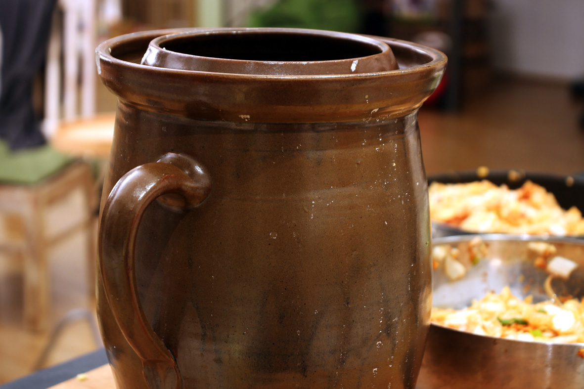 Traditionell verwenden die Koreaner für die Kimchi-Gärung hohe irdene Töpfe mit schweren Deckeln, die halb in die Erde eingegraben (oder auf den Balkon gestellt) werden. Wir sind stolze Besitzer eines irdenen Sauerkraut-Topfes, der einem Kimchi-Topf erstaunlich ähnlich sieht und den großen Vorteil eines Randes mit Wasserrinne hat. Das heißt: Während des nun einsetzenden Gärprozesses ist der Chinakohl luftdicht abgeschlossen, entstehende Gase können aber trotzdem austreten (es blubbert dann leise in der Küche, sehr heimelig).