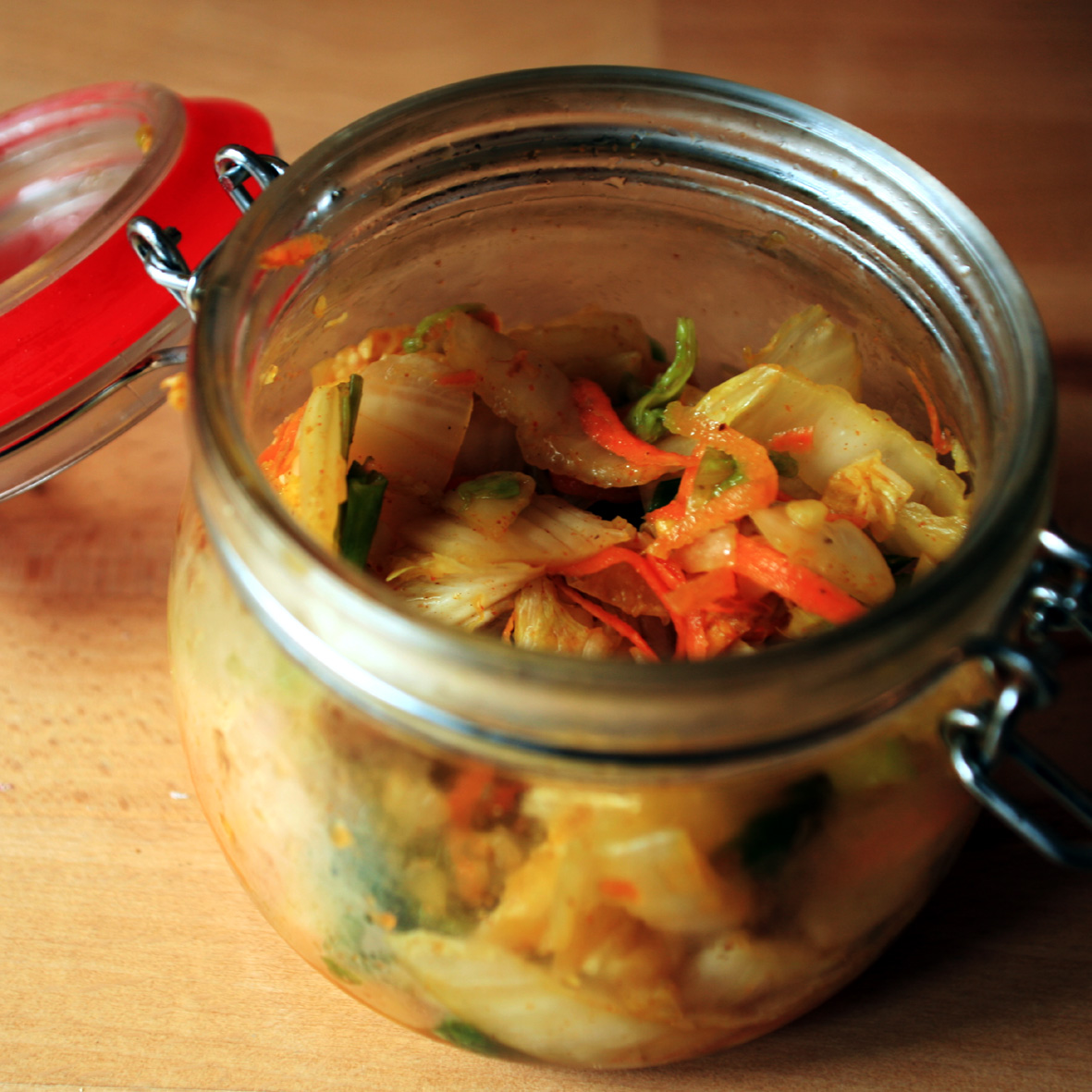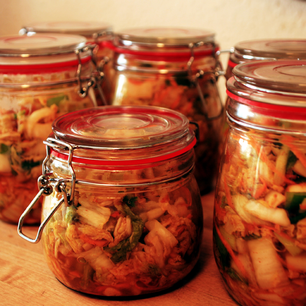 Was sie alle verbindet: der typische, sauer-scharfe Geschmack. Bei der Gärung, die dafür verantwortlich ist, entstehen Milchsäure und Essigsäure, die nebenbei keimtötend wirken. Außerdem enthält fertiges Kimchi erstaunlicherweise mehr Vitamin B1, B2 und B12 als das ursprüngliche frische Gemüse; es senkt außerdem den Cholesterinspiegel und fördert die Verdauung. Okay, man riecht auch ordentlich nach Knoblauch, aber nichts ist nun mal perfekt.