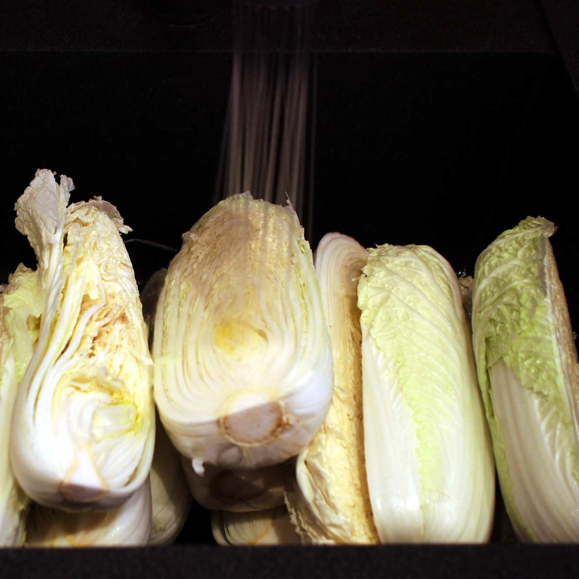 Die Chinakohlköpfe werden geputzt, entkernt und längs halbiert oder geviertelt (reißen ist besser als komplett durchschneiden, damit keine zu kleinen Stückchen entstehen). Die Chinakohlviertel zuerst kurz wässern, dann trockenschütteln.
