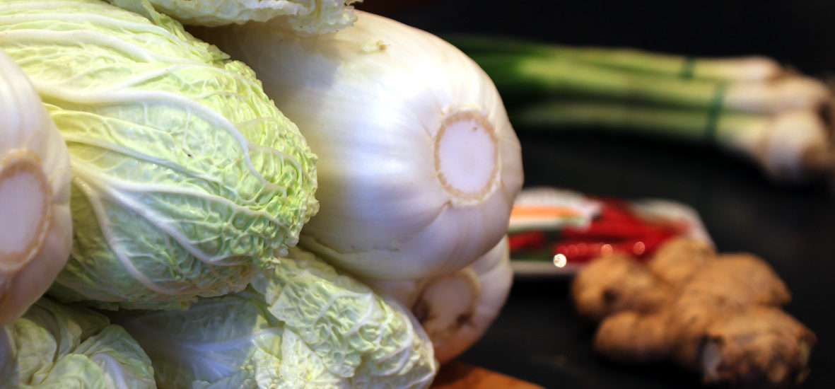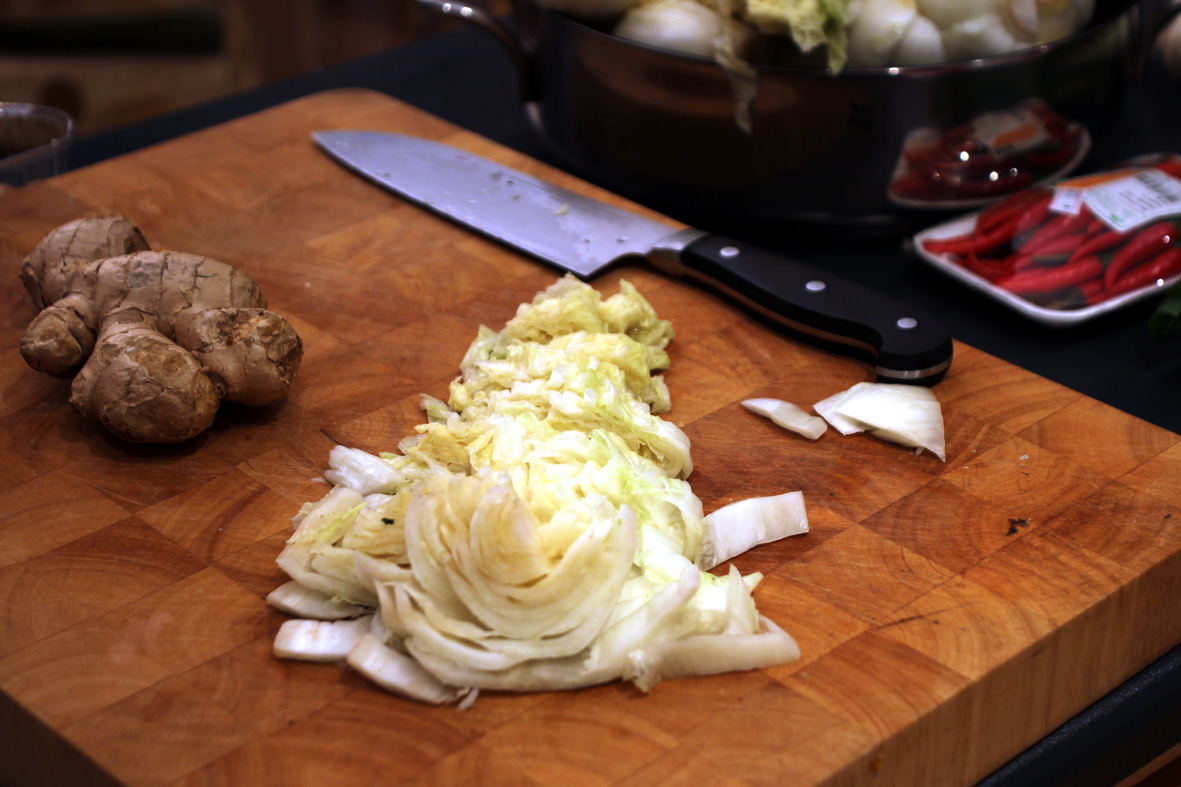 Dann ziehen wir los und suchen zunächst (bezahlbaren) Chinakohl. Vier, fünf Kohlköpfe sollten es schon mindestens sein, damit sich die Arbeit lohnt. Was wichtig ist: Die Blätter sollten möglichst grün und nicht zu dick sein, der Kohlkopf insgesamt fest verschlossen. Und dann geht es los!