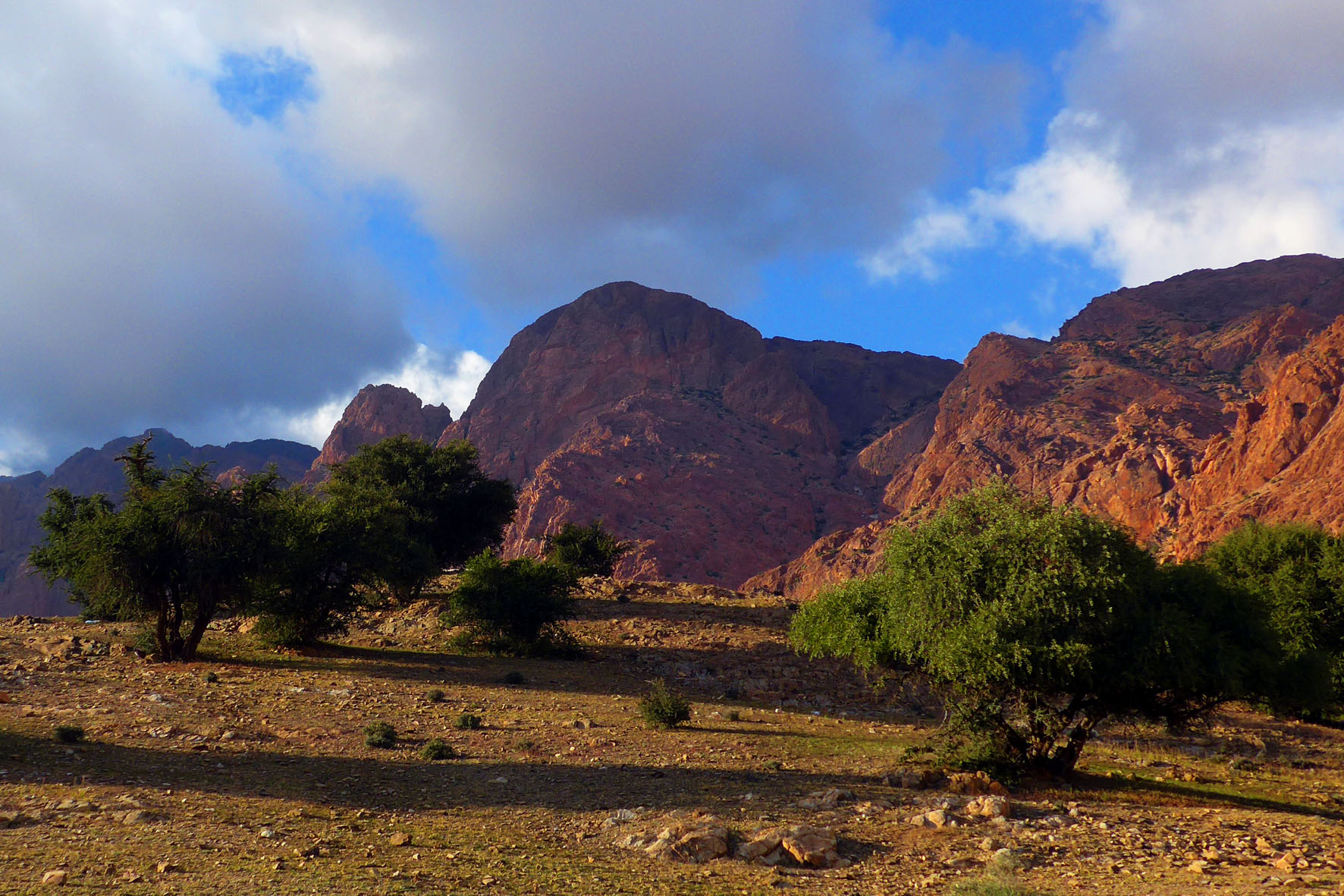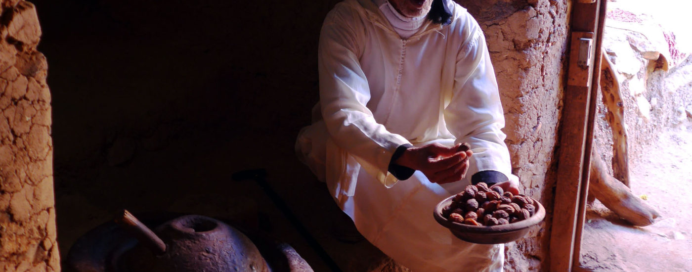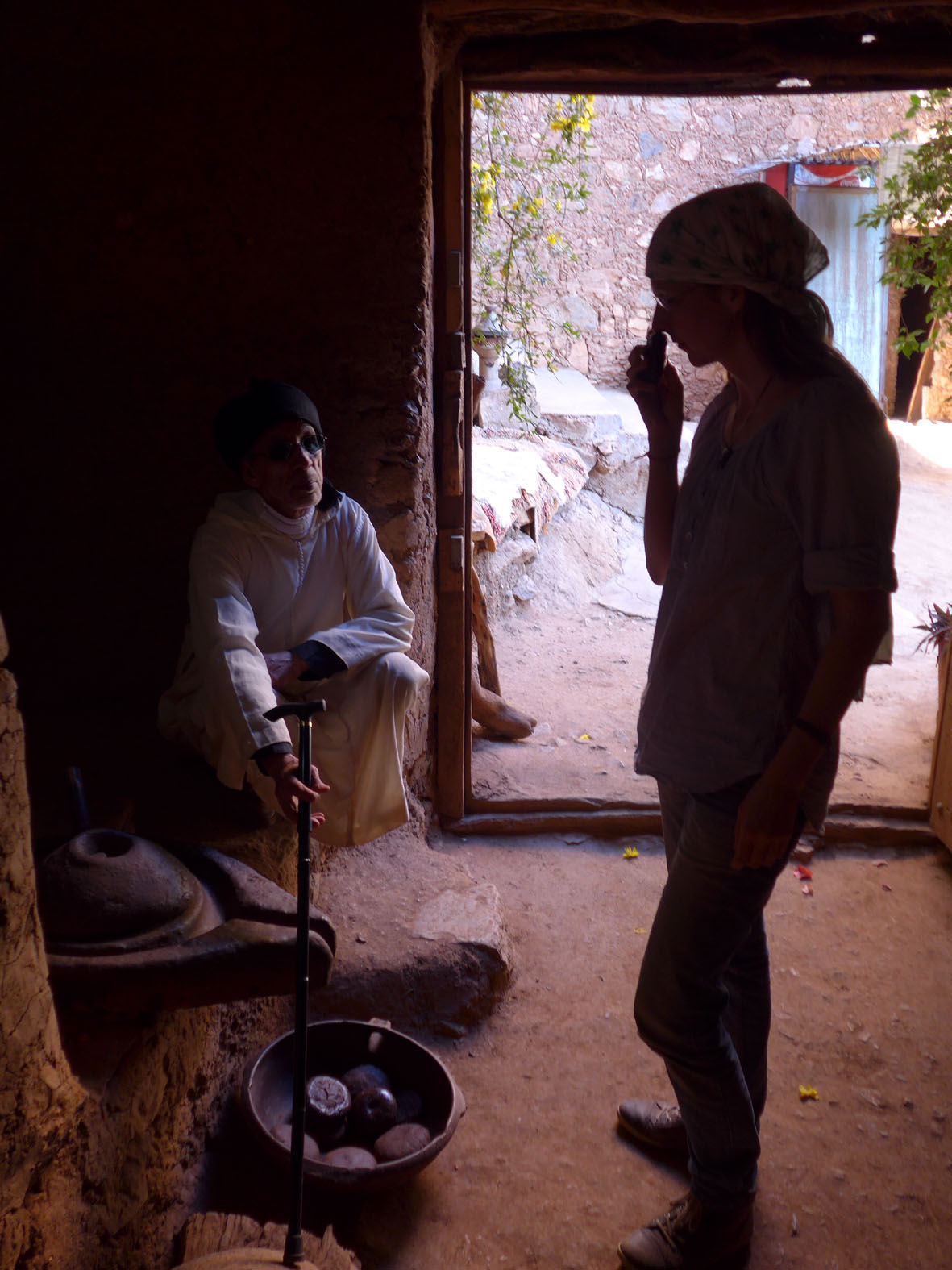 Trotzdem waren wir danach erfrischt genug, um uns von dem alten Mann auch noch durch das Museum im Untergeschoss des historischen, aus Stroh-Lehmziegeln erbauten Hauses führen zu lassen. Dort zeigte er uns eine steinerne Mühle, mit der traditionell Arganöl gepresst wird. Das kostbare Öl stammt von den Samen einer Frucht, die ausschließlich in Marokko wächst – auf Bäumen, die Ähnlichkeit mit Olivenbäumen haben, nur in stachelig, und die in den Bergregionen des Atlas und Antiatlas riesige Flächen bedecken. Die Ölgewinnung ist tief verwurzelt in der Kultur der Berber und wer, wie wir, im Land unterwegs ist, kommt an unzähligen kleinen Läden vorbei, in denen die Frauenkooperativen, die das Öl traditionell herstellen, es direkt verkaufen. Inzwischen gibt es auch industriell gewonnenes Arganöl, das natürlich günstiger ist, aber – wir haben es verkostet – auch weniger aromatisch schmeckt.