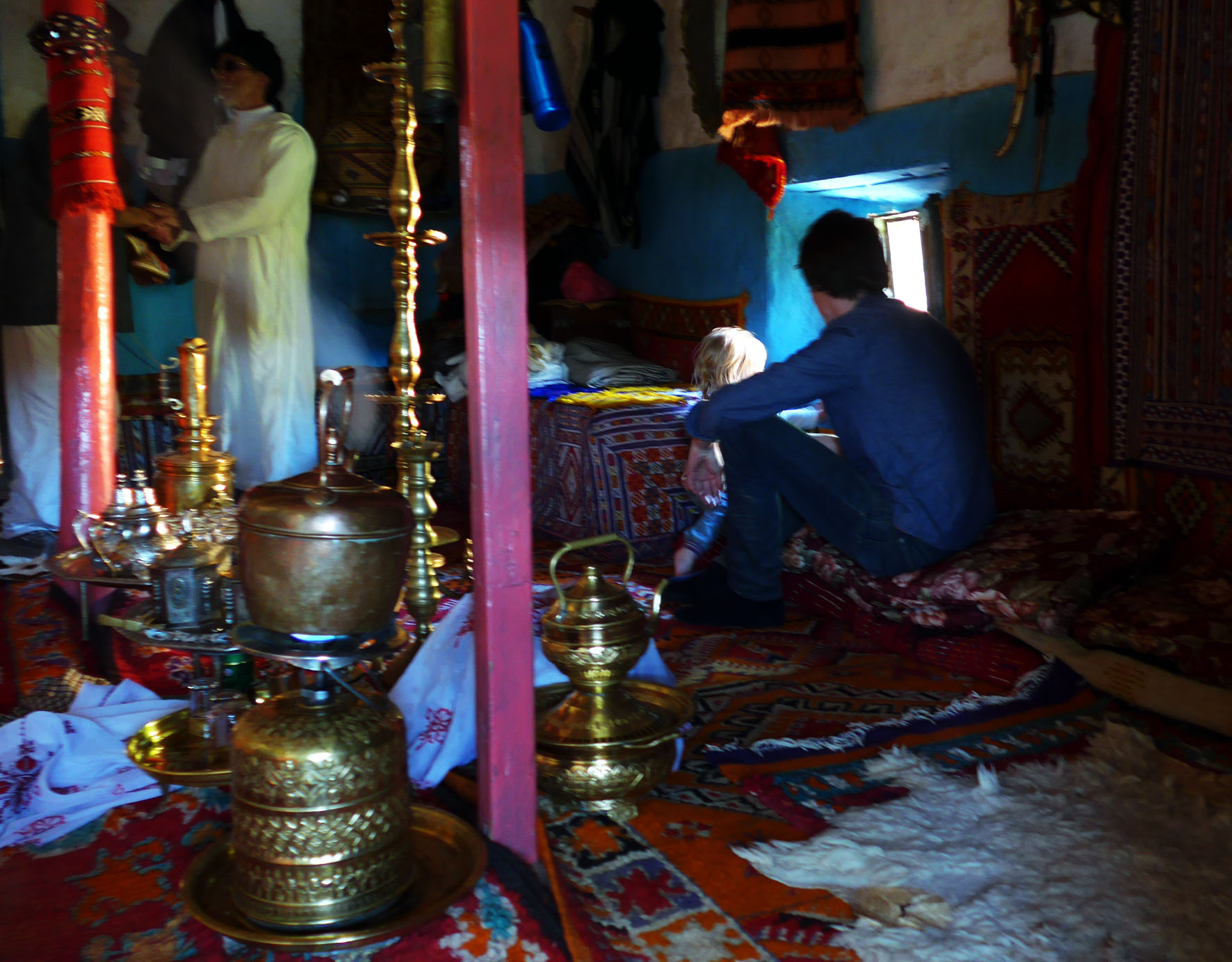 Durstige und hungrige Menschen sind keine guten Zuhörer, ich kann mich deshalb leider nur vage erinnern, dass er uns etwas über die Herkunft des in Marokko verwendeten Tees erzählte und über historische Teepötte, Schuhe, Kleider und Musikinstrumente referierte. Unsere Kleine hatte deutlich mehr Spaß, sie hüpfte über die Kissen, verkleidete sich und tanzte wie ein Drehkreisel durchs Zimmer, als der alte Mann auch noch auf einem Bass-ähnlichen Musikinstrument für uns spielte. Zu diesem Zeitpunkt, unsere Zungen klebten bereits am Gaumen und meine Lippen waren, ungelogen, spröde geworden, stieß eine weitere Familie mit vier Kindern dazu, die mit einem einheimischen Guide unterwegs war. Der brühte dann, endlich, endlich!, einen Tee auf. Und schenkte ihn zu unserem Entsetzen in den kleinsten Gläsern, die uns auf unserer gesamten Reise begegneten, aus. Für einen Nachschlag reichte das Kannenvolumen leider nicht mehr.