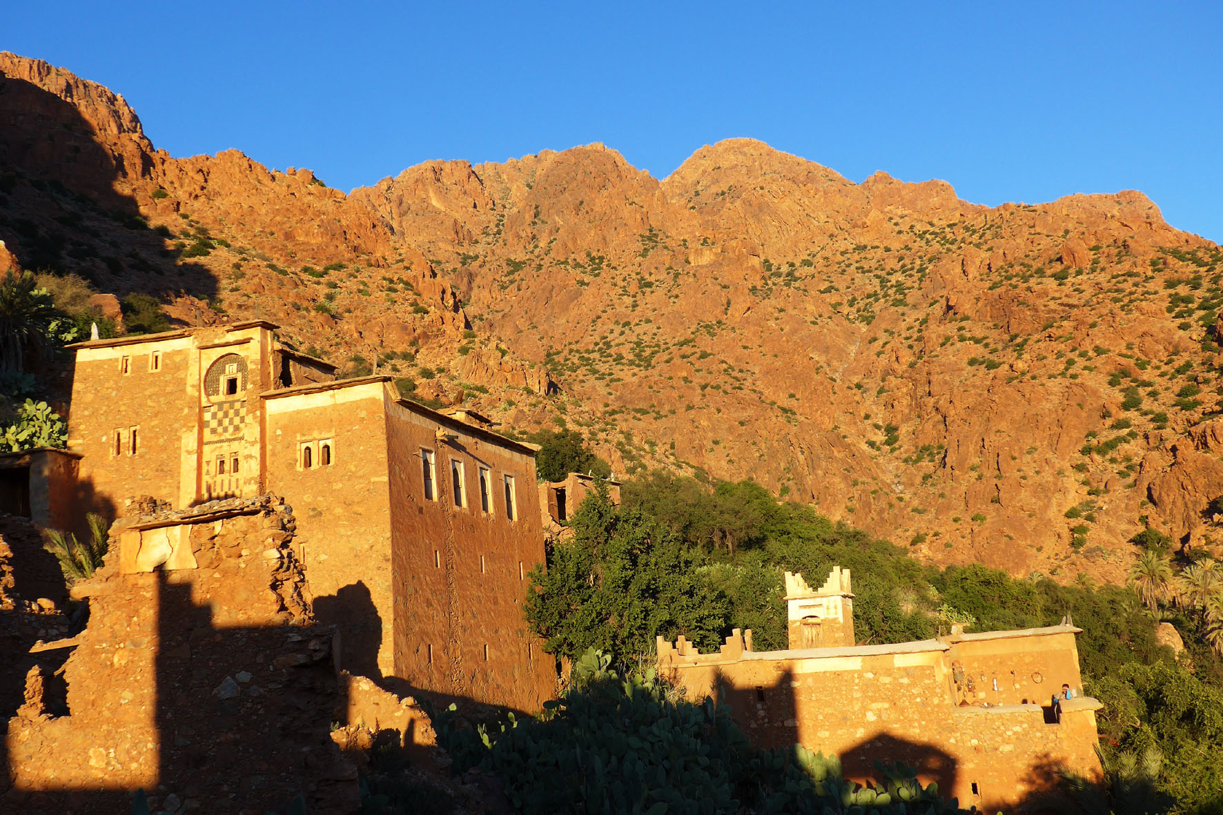 Eigentlich hatten wir im Maison Traditionelle nämlich nur einen Tee trinken wollen. Es war später Nachmittag, wir waren sehr viel ausgiebiger als gedacht durch das hübsche kleine Dörfchen Oumsnat spaziert, das im Vallee des Ammeln am Fuß eines beeindruckenden Felsmassivs liegt. Oder vielmehr: gewandert, denn die Wege waren unbefestigt, steinig und steil. Jedenfalls hatten wir dummerweise unsere Taschen, Wasserflaschen und Snacks im Auto gelassen und waren ziemlich durstig. Wir brauchten dringend eine Pause, wollten einfach kurz sitzen und den Blick ins Tal von dem oben am Berg gelegenen Haus genießen.
