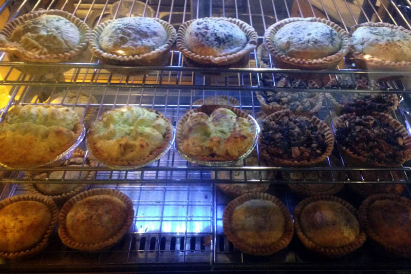 Die Pies werden zwar nicht im Laden selbst gebacken, sondern in der eigenen Großküche (wohl aber die Kuchen – leider war selbst in unserem Dessertmagen kein noch so kleines Plätzchen mehr frei). Der Vorteil daran ist, dass man sie sogar gefroren für die heimische Tiefkühltruhe kaufen kann.
