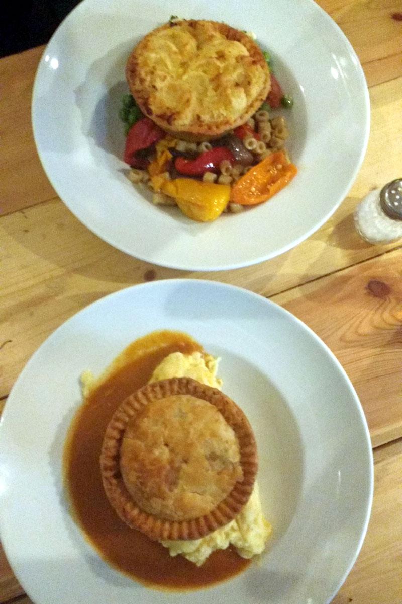 Der Co-Jäger entschied sich für den klassischen Shepards Pie mit Kartoffelbrei-Deckel, dessen Hackfleischfüllung lecker mit Rosmarin abgeschmeckt war. Als Beilage wählte er aus einer ganzen Reihe von Salaten grüne Minz-Erbsen mit Feta sowie einen Nudelsalat mit Paprika. Ich liebäugelte erst mit Steak & Guinness, entschied mich dann aber für den Winter Veggie Pie, gefüllt mit allerlei Wurzelgemüse, dazu Kartoffelstampf mit Cheddarstückchen, damit ich auch garantiert satt werde. Ich hätte mich nicht sorgen brauchen, zum Schluss blieb sogar etwas auf dem Teller und ich kugelte über Schnee bedeckte Gehwege nach Hause. Aber wer kann zu einem Berg Kartoffelbrei, der jedes Mal, wenn man mit der Gabel einen Bissen herunternimmt, dicke Käsefäden zieht, und einem riesigen Schöpfer Bratensauce schon Nein sagen?