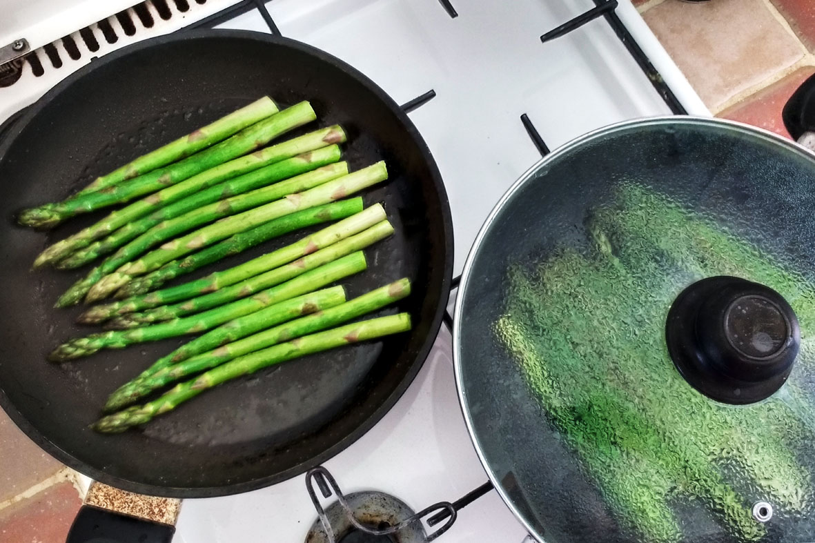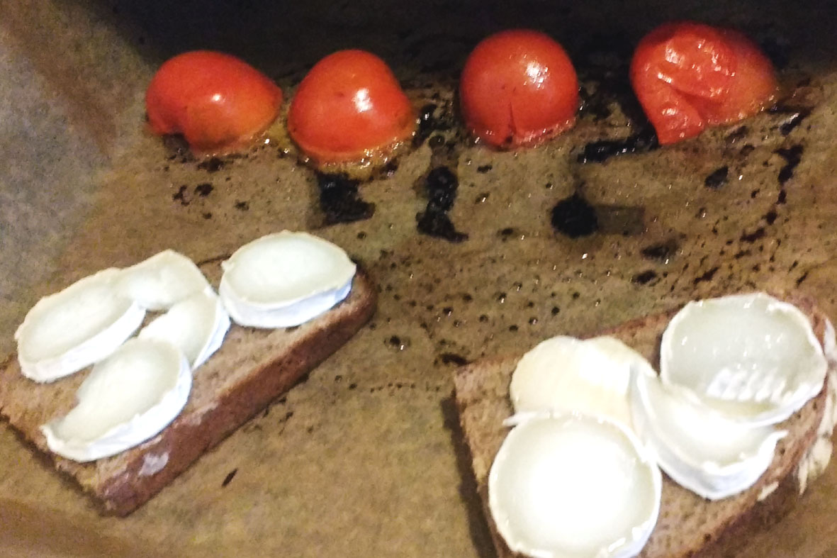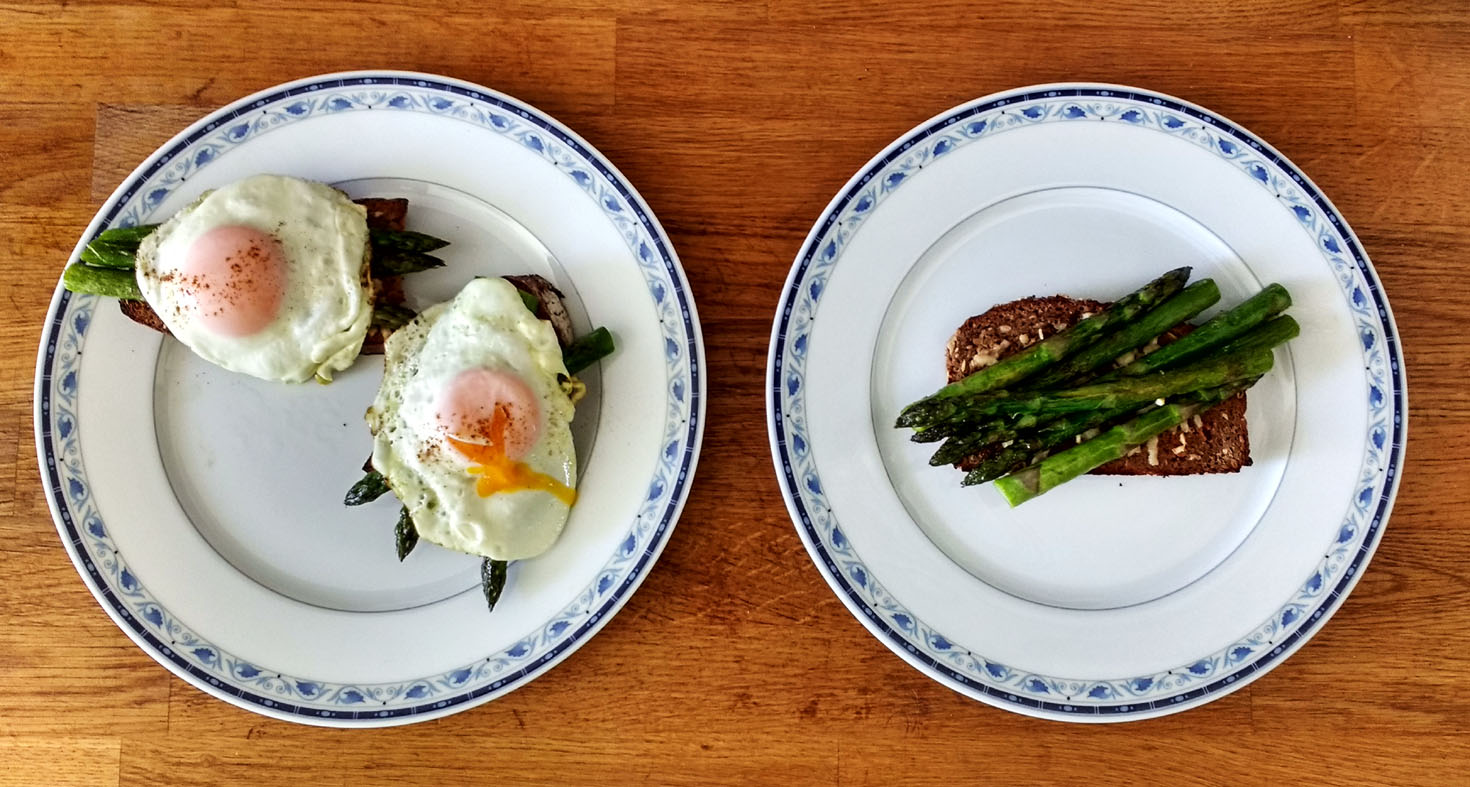 Beide Male röste ich das Brot – einmal mit Olivenöl gesprenkelt und mit Ziegenkäse belegt, das andere Mal gebuttert und mit gehobeltem Parmesan bestreut – in unserem ganz normalen Backofen ohne Grillfunktion. Die halbierten Tomaten lege ich ebenfalls einfach aufs Blech und, nachdem sie schön weich geworden sind, auf das Ziegenkäsebrot und streue fein gehackten Bärlauch darüber. Die grünen Spargelstangen schwenke ich in der Pfanne, erst kurz auf hoher Temperatur, dann auf niedriger mit geschlossenem Deckel. Dazu brate ich zwei Spiegeleier.