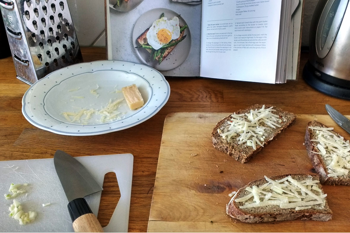 Für beide Rezepte (die ich an unterschiedlichen Tagen probiere) brauche ich jeweils etwa 30 Minuten, was auch für unter der Woche im Rahmen ist. Beide schmecken ausgezeichnet und die Parmesanstulle mit Spargel und Spiegelei empfinde ich tatsächlich als gleichwertig zu einem „normalen“ Mittagessen, weil sie aus ganz unterschiedlichen Elementen besteht, die ich ohne Anregung durch das Kochbuch wohl nicht auf einer Scheibe Brot versammelt hätte. Satt werde ich von beiden Varianten.