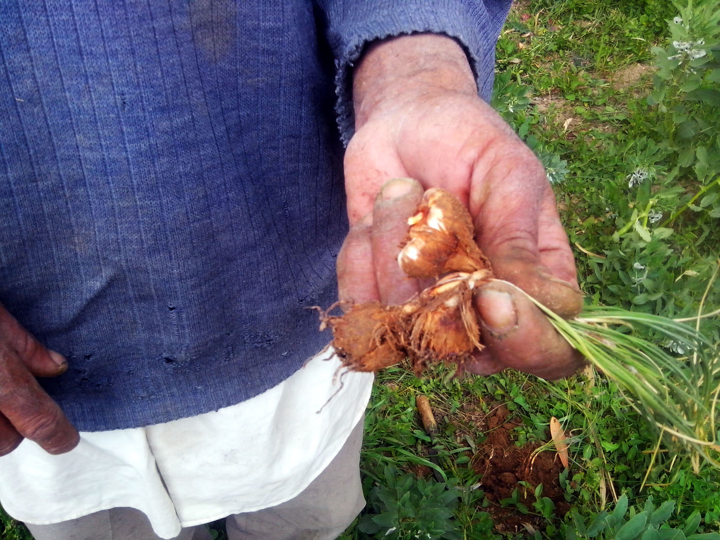 Von den vielen Restaurants in Taliouine, die typisch marokkanische, mit dem roten Gold verfeinerte Gerichte anbieten, wählten wir die Auberge Le Safran, denn sie arbeiten mit Gemüse und auch Safran aus eigenem Anbau. Den wollten wir uns natürlich anschauen. Nach dem Essen (anders als auf der Internetseite angegeben, standen auf der Tageskarte nur die bereits gewohnte Tajine, Omelette und, oha, Gemüse mit Safranreis zur Auswahl) spazierten wir also hinters Haus in den hübsch angelegten, aber überraschend kleinen Gemüsegarten. Dort waren Abdulah und seine Frau gerade dabei, die im Februar etwa 10cm hohen und natürlich noch blütenlosen Safran-Pflanzen zu vereinzeln, und zeigten uns freundlicherweise einige ausgegrabene Exemplare.