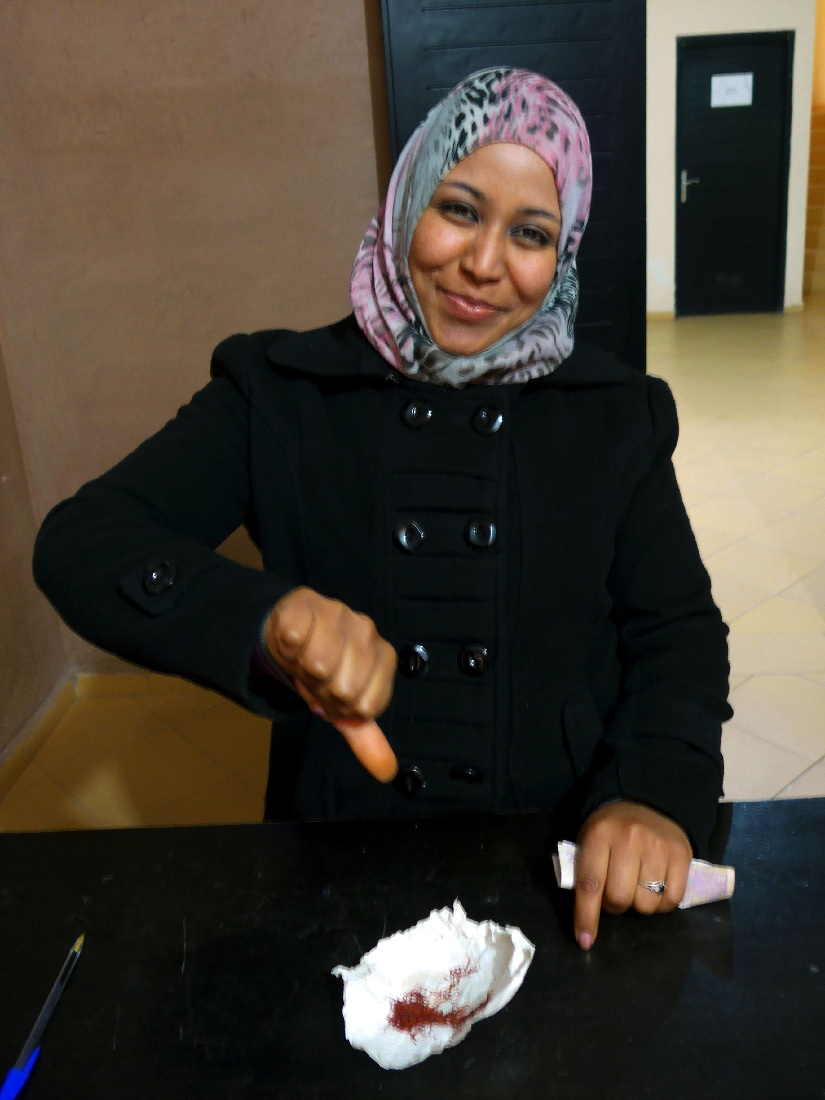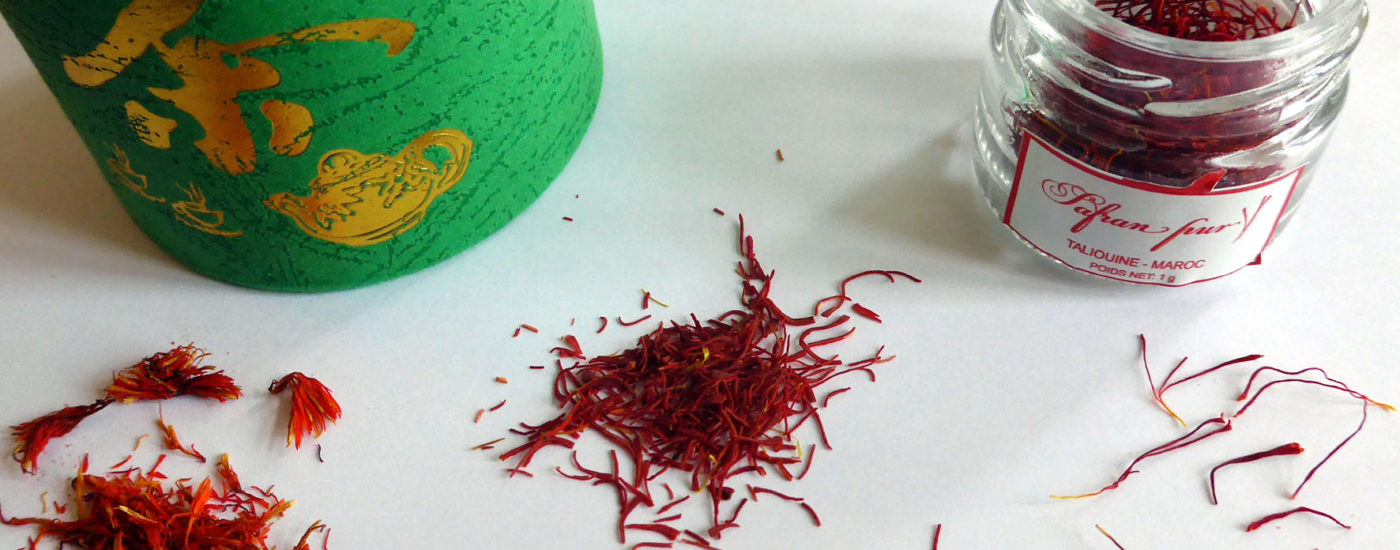 Auch die Finger werden gelb, wenn man zwischen ihnen einen Faden zerreibt. Im Dar Azaafaran durfte wir das ganz selbstverständlich versuchen – Raja Barchmim öffnete sofort ein Gläschen mit dem Gewürz für uns und erklärte uns die Merkmale, an denen man das Echte zweifelsfrei vom Gefälschten unterscheidet. Ein zweites Indiz ist der Geruch: Unser Produkt riecht nach gar nichts, während uns aus dem kleinen Gläschen ein intensives, herbes und zugleich leicht süßliches Aroma in die Nase stieg. Die Fäden sind außerdem hauchzart (unsere erinnern eher an sehr dünne Lakritze), am einen Ende etwas heller und am anderen dreigeteilt. Für ein Gramm, das wir schließlich kauften, zahlten wir vier Euro.