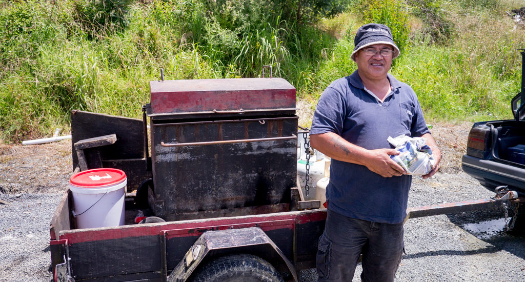 Was denn in der Box sei, frage ich den gemütlichen Maori, als er aus seinem Auto steigt und mein „Hello“ mit einem „Kia Ora“ erwidert. „Mutton, Kumara, Pumpkin and Stuffing“, macht er mir den Mund wässrig, holt ein in Alufolie verpacktes Päckchen heraus und öffnet es kurz, um mir den Inhalt zu zeigen. Ich kaufe eine Portion ($12) als Lunchsnack, die er in zusätzliches Zeitungspapier einwickelt.
