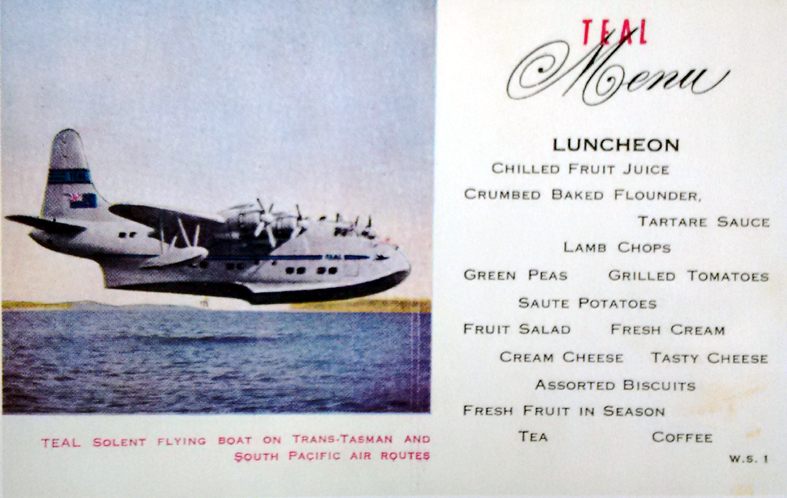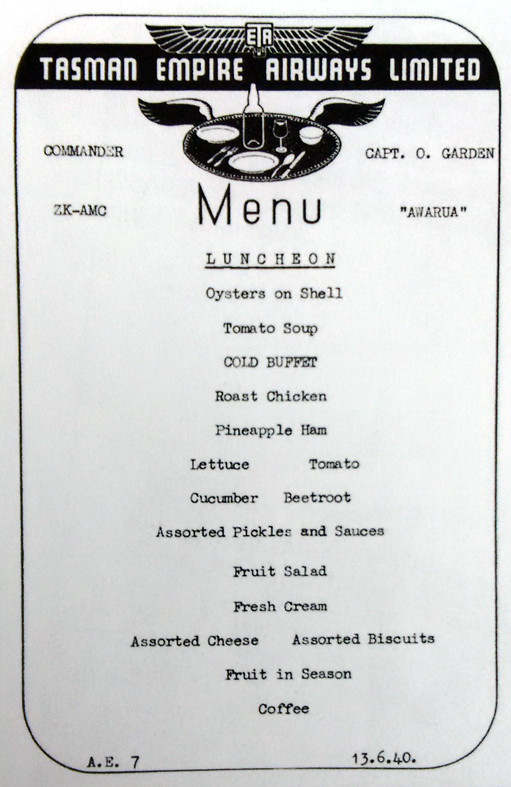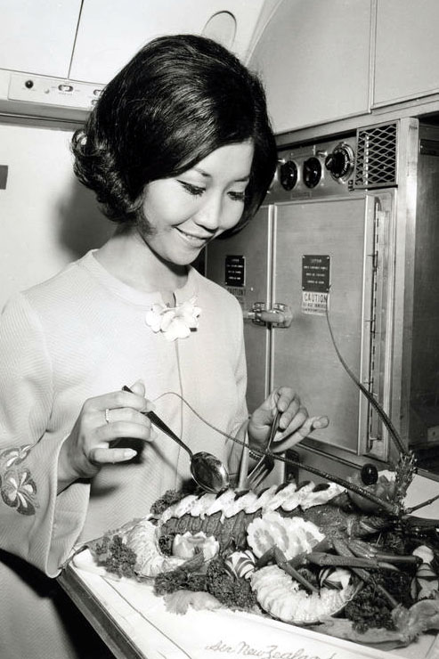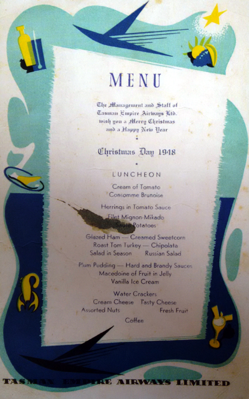 Es gab eine Zeit, da war Flugzeugessen noch keine Massenabfertigung. Essen wurde damals schön angerichtet serviert – ganz so als habe die Stewardess die Fluggäste persönlich zu sich nach Hause in die gute Stube eingeladen. Bei Air New Zealand wurde das Essen in den ersten Jahren – wir sprechen von Mitte des 20. Jahrhunderts – noch im Flugzeug frisch zubereitet. An Weihnachten gab es damals, als Fliegen noch etwas ganz Besonderes war, das nur wenige Menschen taten, sogar ein viergängiges Feiertagsmenü (siehe Foto).