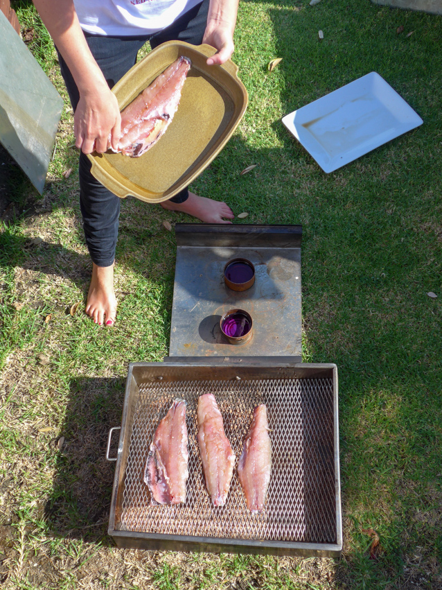 Bisher dachte ich immer, dass es Tage oder sogar Wochen dauert, frischen Fisch in diese köstlichen, saftigen Happen mit der feinen Rauchnote zu verwandeln. Keine Ahnung, warum ich das annahm, womöglich dachte ich dabei an in Holzfässern gelagerten Wein oder Whiskey. Als unsere Freundin Conor daher vorschlug, doch ein bisschen Fisch zu räuchern, damit wir etwas davon mitnehmen könnten, war ich überrascht. Wir kennen Conor aus Berlin und weil sie gerade zu Besuch bei ihren Eltern ist, hat sie uns eingeladen vorbeizuschauen. „Ach, das Räuchern dauert doch nur 20, 30 Minuten!“, erklärte sie uns. „Und wenn ihr Lust habt, können wir selbst mit dem Netz rausgehen und uns Mullets und ein paar Schollen fangen.“