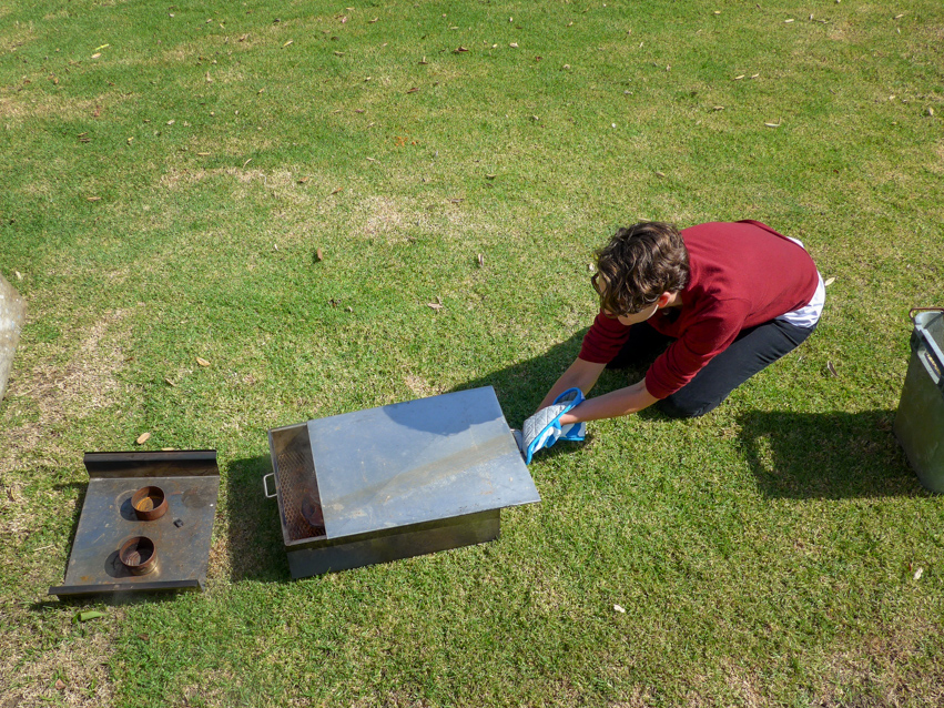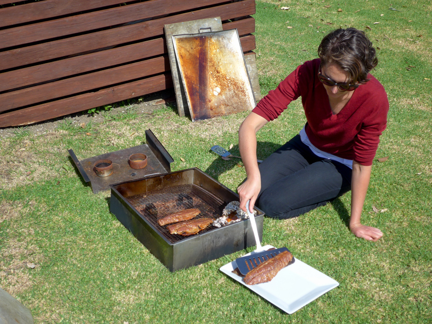 In Conors Familie wird zum Räuchern ein Edelstahlbehälter etwa von der Größe einer Weinkiste verwendet, den ein Freund ihres Vaters vor vielen Jahren angefertigt hat. Auf den Boden streut man Holzspäne – in Neuseeland gerne vom Manukastrauch, aber wir verwenden Pohutukawa, da vom letzten Beschneiden des Baumes im Garten noch Späne übrig sind. Dann legt Conor die Filets, die sie mit Salz und Zucker eingerieben hat, auf den Rost, der etwa mittig in der Kiste sitzt, und als Experiment auch noch die ziemlich großen, knallorangen Rogen der Fische. Im Geschäft bekommt man ja immer nur den Inhalt, die Eier, hübsch in Gläschen verpackt. Aber wenn man sie so frisch aus dem Fisch holt, sind sie noch von einer Membran umhüllt, über die sich Blutgefäße ziehen. Einen hat die Katze bekommen. Nach dem ersten Bissen quoll der Inhalt heraus, der sich mit gutem Willen als cremig bezeichnen lässt. Ein gewöhnungsbedürftiger Anblick.