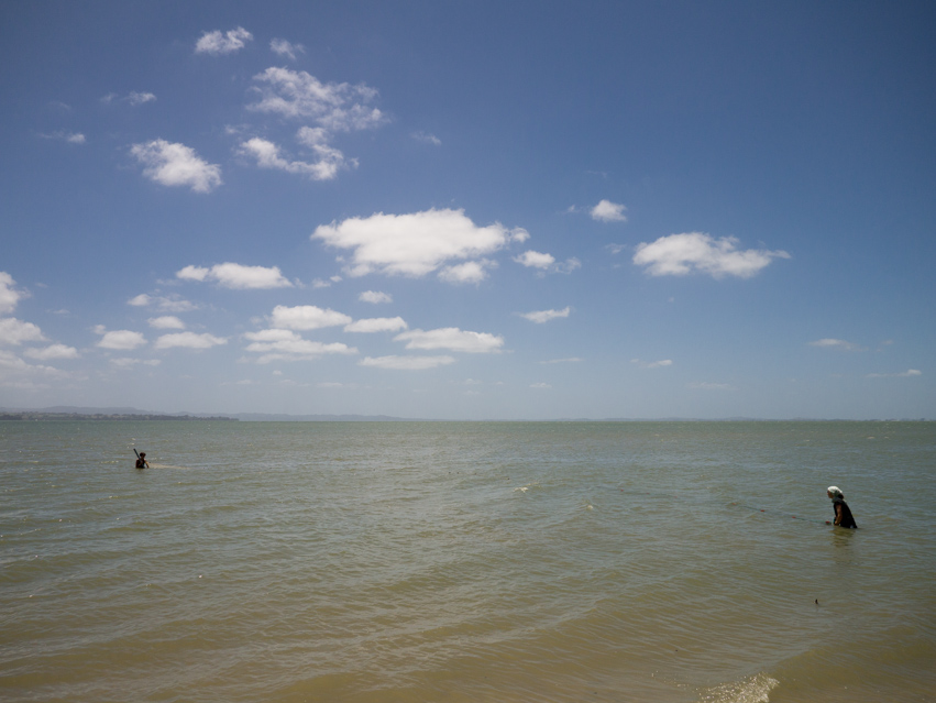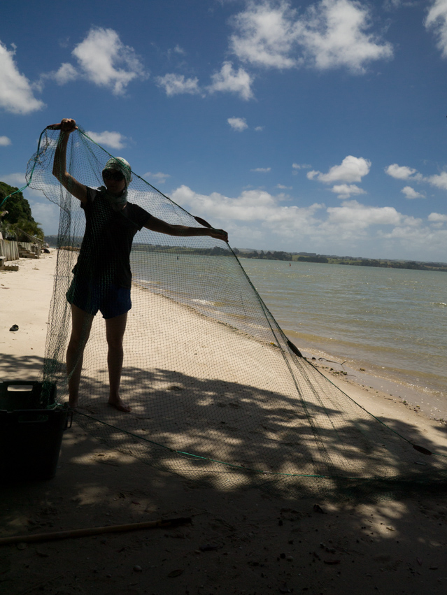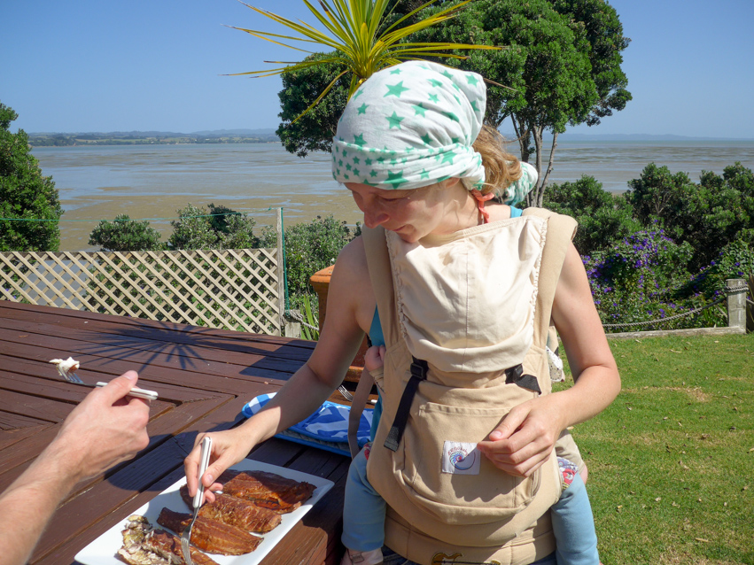 Am Abend kam eine Nachbarin, Faye, vorbei und brachte uns Mullet-Filets, die sie selbst geräuchert hatte. Sie schmeckten leicht süßlich, ungewöhnlich, und sehr lecker. Die Nachbarn hatten uns dabei zugeschaut, wie wir (erfolglos) mit dem Netz hantierten, und wollten den Co-Jäger und mich nicht abreisen lassen, ohne etwas probiert zu haben. „Mein Mann hat sein Netz ausgelegt, das holt er morgen ganz früh ein“, erzählte uns Faye noch, und zeigte hinaus auf die weite, in allen Blau-, Braun- und Grautönen schimmernde Wattlandschaft, in die sich der Manukau Harbour bei Ebbe verwandelt. Wenn wir Lust und vor unserer Weiterfahrt noch Zeit dafür hätten, könnten wir dann ein paar Fische bekommen und sie selbst räuchern.