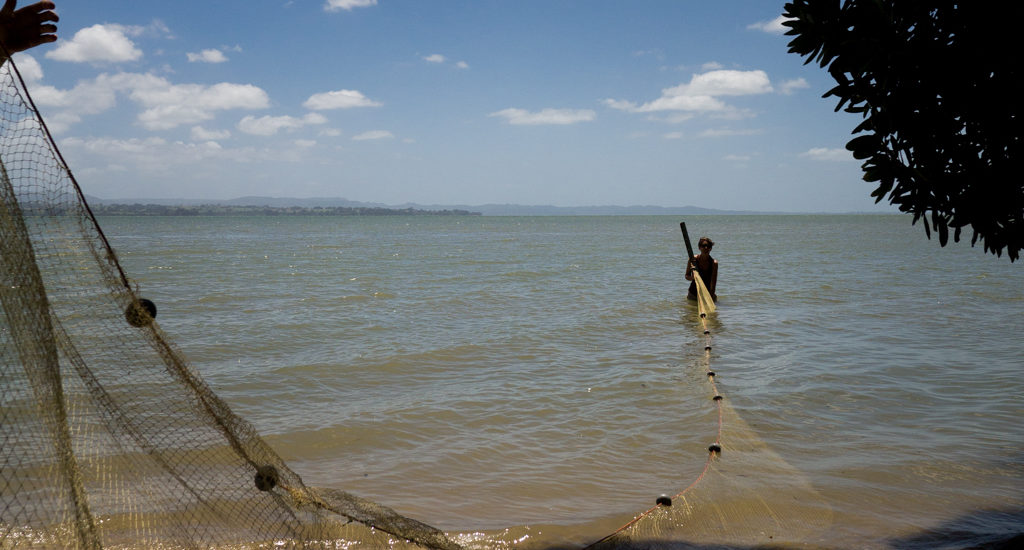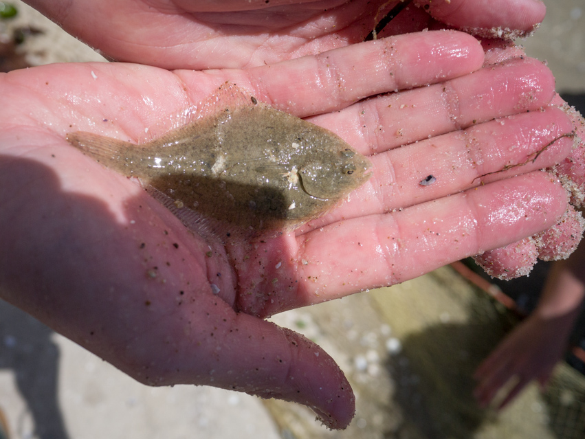 Wir also das Netz rausgeholt, schnell noch ein paar Löcher geflickt, während die Flut langsam hereinkam. Das Netz ist etwa einen Meter hoch und 15 Meter lang. Oben sitzen Schwimmer, unten kleine Gewichte, die es auf dem Boden halten, damit die Schollen, die sich auf dem Meeresgrund herumtreiben, nicht entwischen können. Man braucht zwei Leute, um damit zu fischen: Einer bleibt in Strandnähe – das war mein Job -, und derjenige am anderen Ende watet ins Meer hinaus und geht dann in einem großen Bogen wieder zum Strand zurück. Bei unserem letzten Versuch stand Conor bis zum Hals im Wasser und ich bis zum Bauchnabel, und es brauchte ziemlich viel Kraft, das Netz wieder an Land zu ziehen. Kaum zu glauben, das Ding besteht ja praktisch nur aus Löchern. Machte aber auch viel Spaß. Leider fingen wir trotz mehrerer Versuche nur ein paar Krabben und zwei Baby-Schollen, die wir wieder zurück warfen.