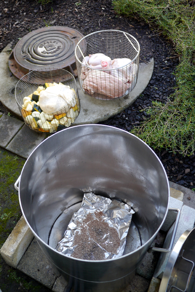 4. Wenn das Feuer herunter gebrannt ist, werden die angefeuchteten Säcke auf die glühend heißen Steine gestapelt. Das Fleisch kommt nach unten, das Gemüse darauf.