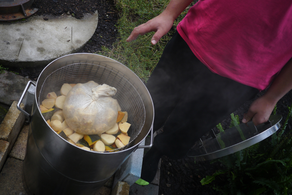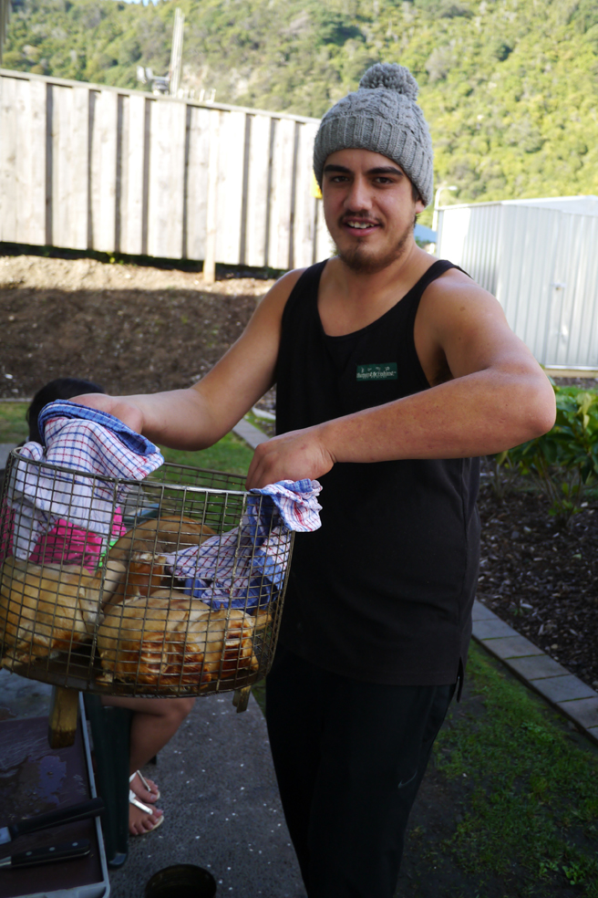 Der 19-Jährige setzt das Hangi so routiniert an, als hätte er sein Leben lang nichts anderes getan. Dabei unterstützt er erst seit einem halben Jahr seine Mutter Hinauri – die zugleich Managerin des seit 2011 auch touristisch genutzten Marae ist – in der Küche. Gerade erst haben sie mit vier, fünf weiteren Helfern für 400 Gäste gekocht. Dagegen ist das heutige Essen für unsere siebenköpfige Journalistengruppe natürlich ein Spaziergang im Park. Die Stimmung beim Kochen ist jedenfalls sehr entspannt. Die beiden beantworten nicht nur geduldig meine 1000 Fragen, ich darf sogar mithelfen.