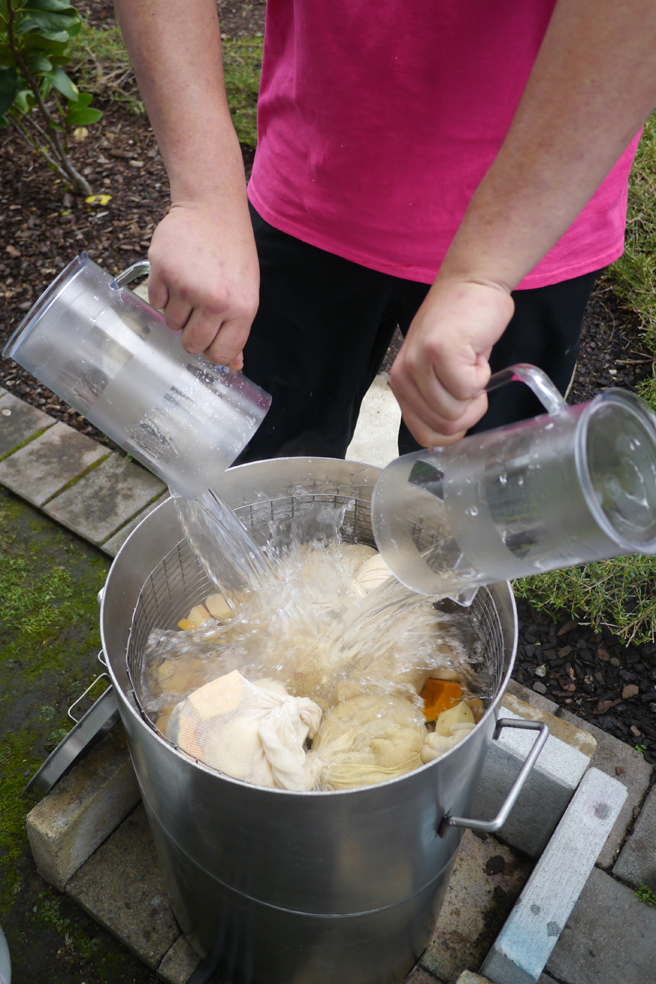 5. Wasser dazu und ganz schnell die Grube wieder mit Erde zuschaufeln, so dass der entstehende Dampf darin bleibt.