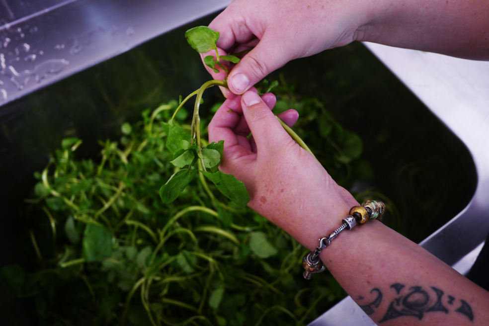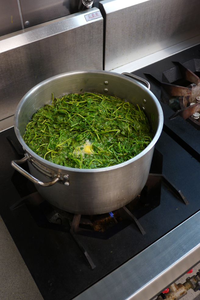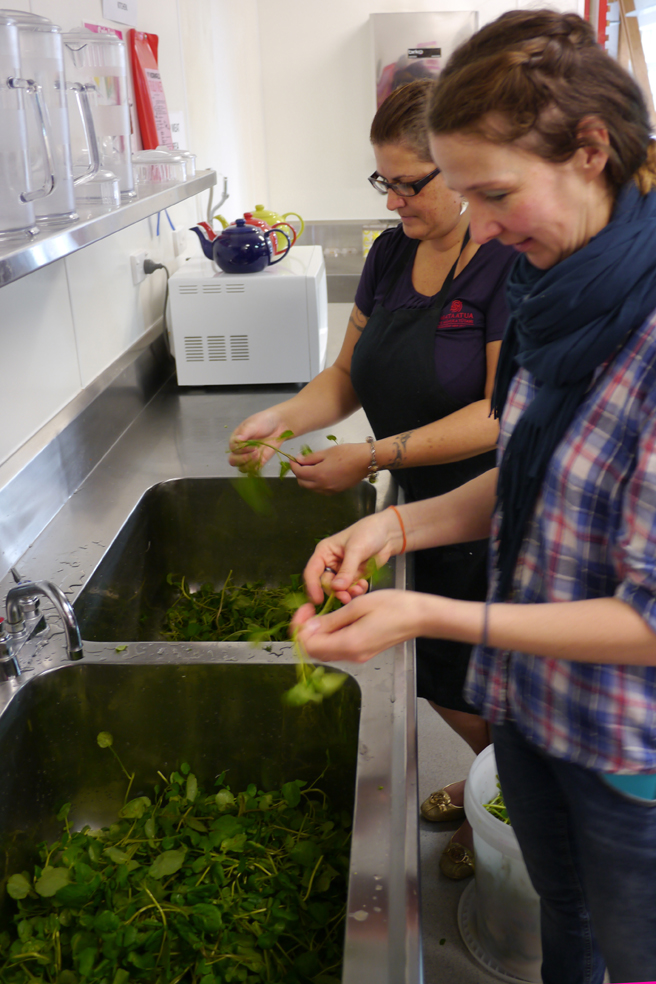 Nachdem das Hangi angesetzt ist, kümmern wir uns um die Beilagen. Da ist zum einen Wasserkresse, die wild im Fluss hinter Hinauris Haus wächst und von ihr so gepflückt wird, dass die Pflanze nachwachsen kann. Wir befreien sie von den allzu dicken Strunken, waschen sie und kochen sie dann in Wasser, dem ein ordentliches Stück Butter beigefügt wurde. Leider geht die milde Schärfe der Kresse dadurch verloren, gegart erinnert sie mich an Spinat mit einem leicht erdigen Beigeschmack. Wir zupfen Weißbrot in kleine Stücke und lassen es dann von der Küchenmaschine in feine Brösel zermahlen, bevor wir es mit Kräutern würzen. Auch hier darf ein Stück Butter nicht fehlen. Hinauri nennt es „stuffing“, obwohl wir gar nichts damit füllen.