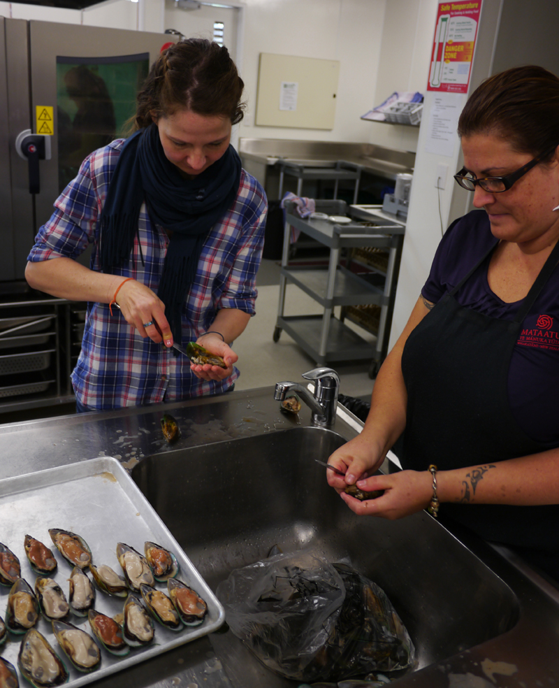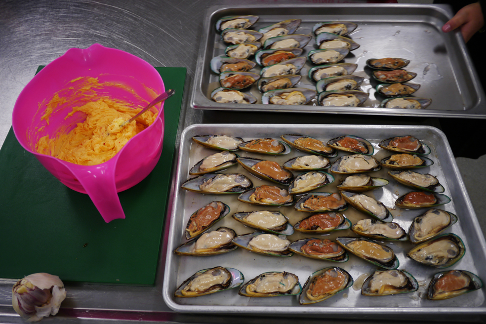 Und schließlich öffnen wir mehrere Dutzend Grünlippenmuscheln, da auf der Schale im Ofen gebacken werden sollen. Bei Hinauri sieht das kinderleicht aus: Sie steckt ein stumpfes Messer an der Seite zwischen die beiden Schalen, bewegt es an der Naht entlang einmal fast ringsum und klappt sie dann auseinander. Die Muschel ist innen an drei Stellen an der Schale angewachsen, diese müssen ebenfalls durchtrennt werden, bevor man das Fleisch auf eine der beiden Hälften legen kann. Nach ein paar Exemplaren gebe ich auf (das Muschelnknacken konnte ich schon beim letzten Mal nicht) und bereite lieber die fertig halbierten Grünlippen für den Ofen vor, indem ich – was auch sonst – Butter hineinschmiere, die vorher mit Knoblauch, Salz und Pfeffer gewürzt wurde. Übrigens sind die Muscheln je nach Geschlecht unterschiedlich gefärbt.